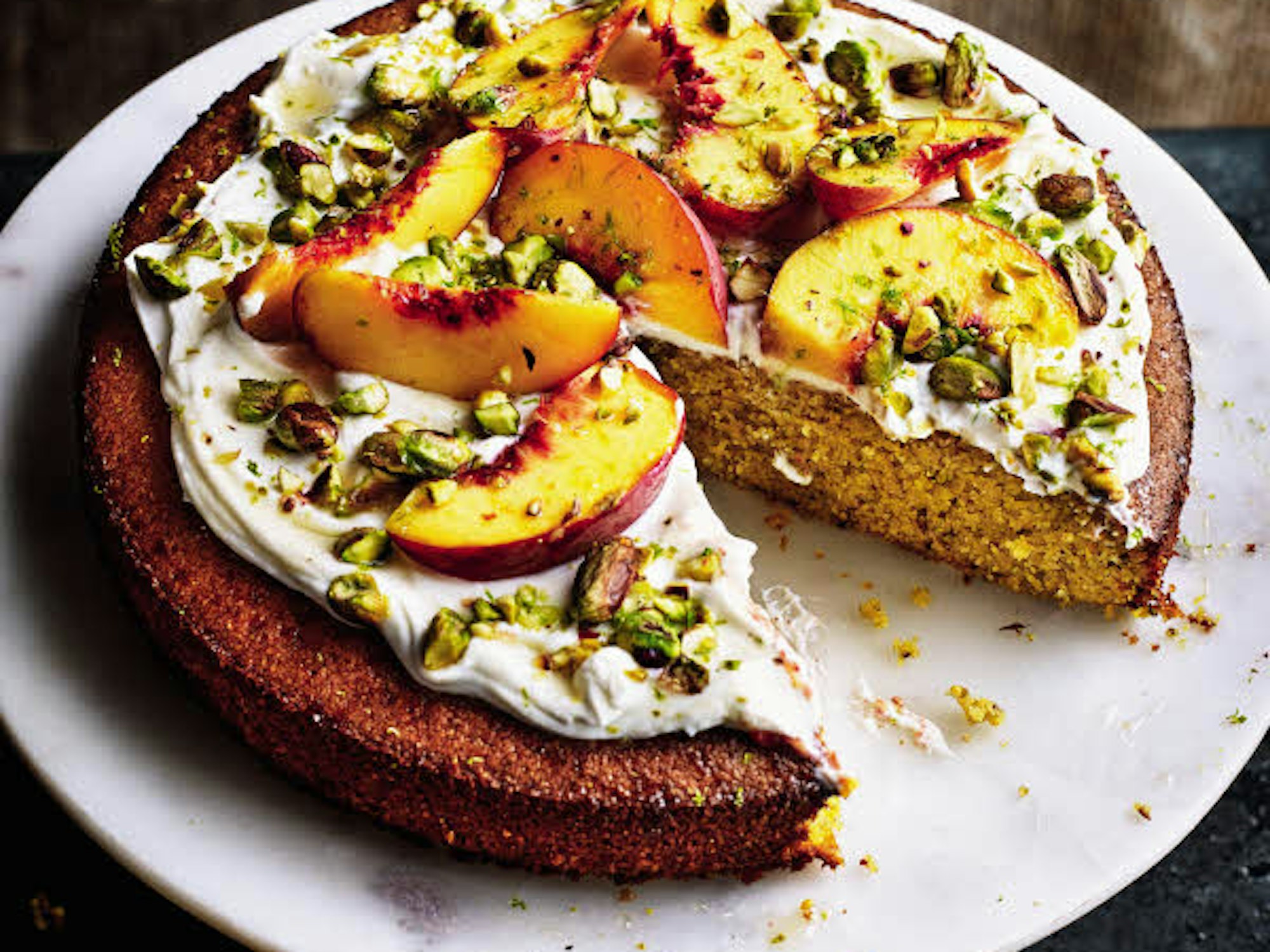 Polentakuchen mit Pfirsich und Pistazie als runder Abschluss.