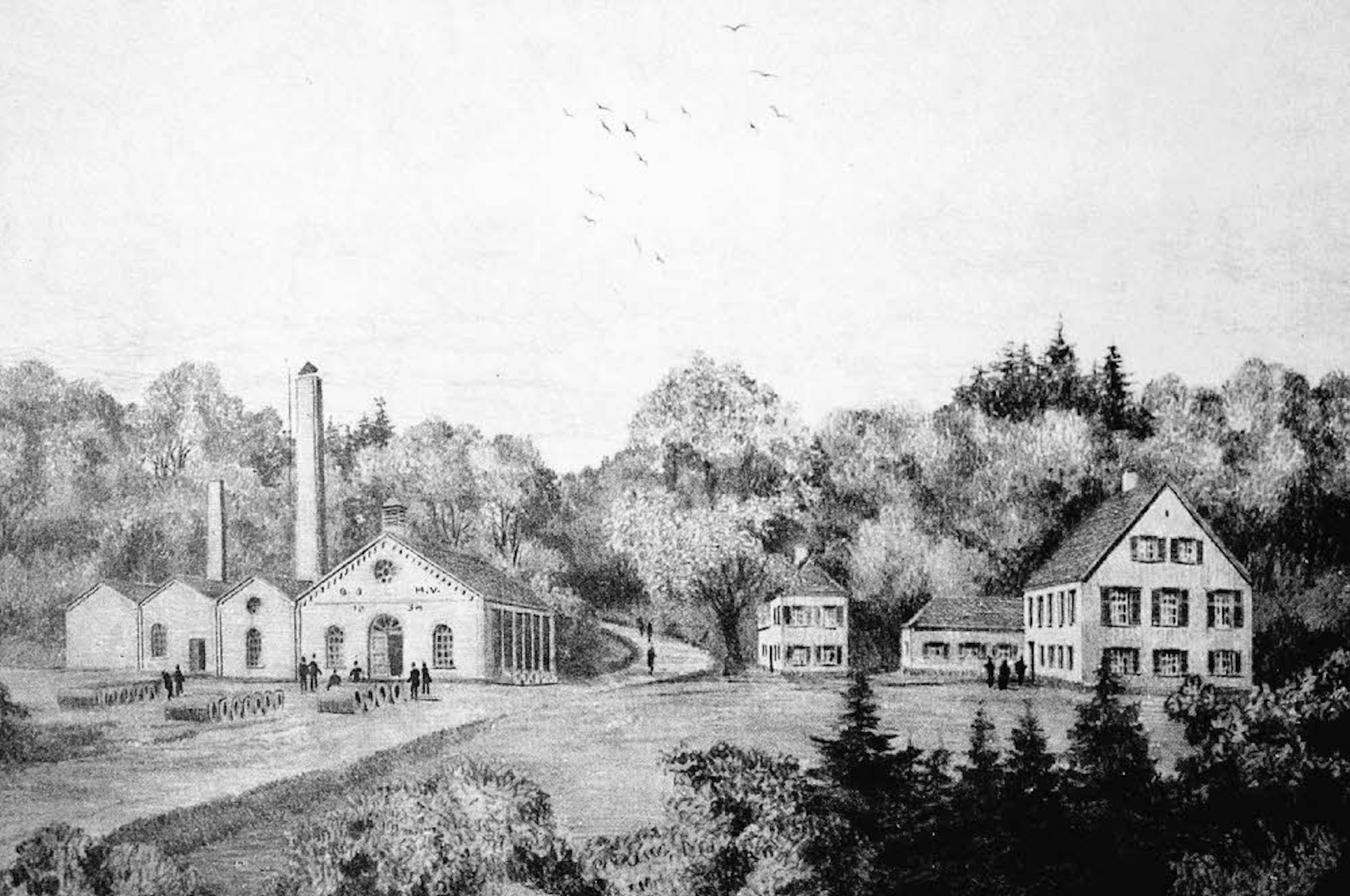 Das „Forsthaus“ im Wald war das Verwaltungsgebäude einer der Fabriken, die Alaun in einem aufwendigen Verfahren aus schwefelhaltiger Braunkohle gewannen, wie diese Zeichnung zeigt.