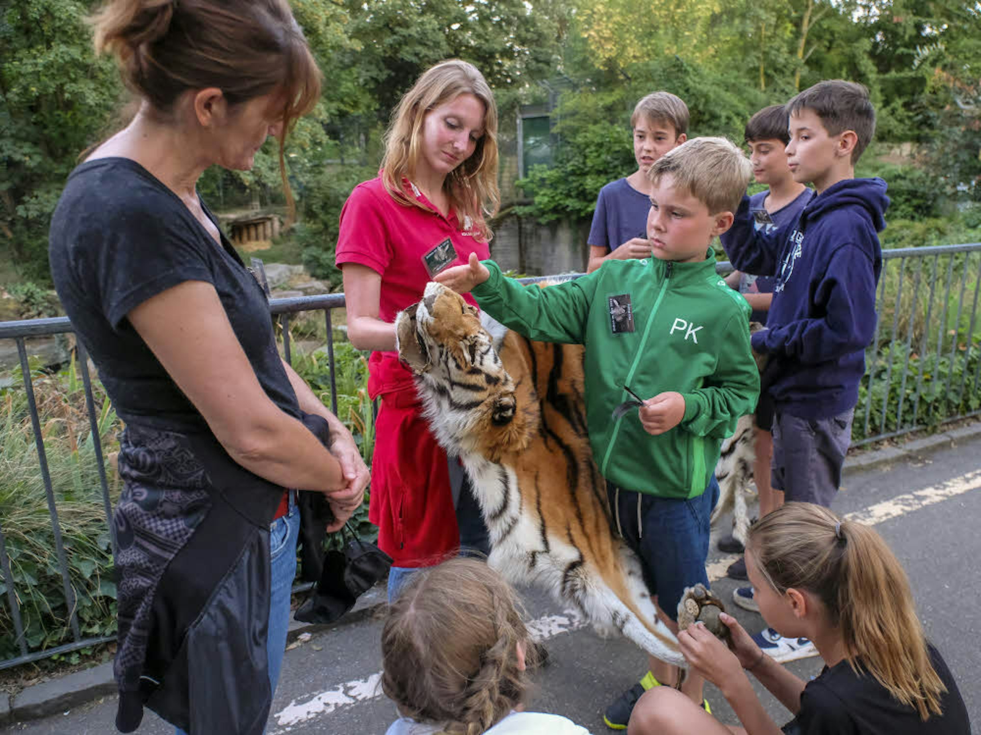 Frederik öffnet eine Kiste und nimmt ein Gepardenfell heraus. Es fühlt sich weich und warm an, die Krallen wirken immer noch scharf und gefährlich. „Geparden können die Krallen einziehen“, sagt Sophie (11). Sie weiß schon viel über Katzen und Hunde und möchte demnächst ein Praktikum bei den Tierpflegern machen. Das ist übrigens nicht das Fell von „Nelson“. Der Gepard war vor sechs Jahren aus seinem Gehege ausgebrochen und verbrachte ein paar Minuten bei den Flamingos, bevor die Pfleger ihn zurückbringen konnten. Nelson starb einige Wochen später an einer chronischen Nierenkrankheit. Dieses Fell und auch ein Tigerfell, mit dem die Zoo-Begleiter die Eigenschaften der Raubtiere erklären, wurde vom Zoll am Flughafen beschlagnahmt. „Geparden sind die schnellsten Tiere, die sich an Land bewegen“, erklärt Frederik, „sie schaffen bis zu 120 Stundenkilometer“. Im Zoo gibt es eine neue Trainingsmethode: Mit einer Seilwinde werden Leckereien durchs Gehege gezogen, damit die Geparden sich verausgaben können. Das Fleisch saust los, zwei Geparden spannen die Muskeln und jagen hinterher.