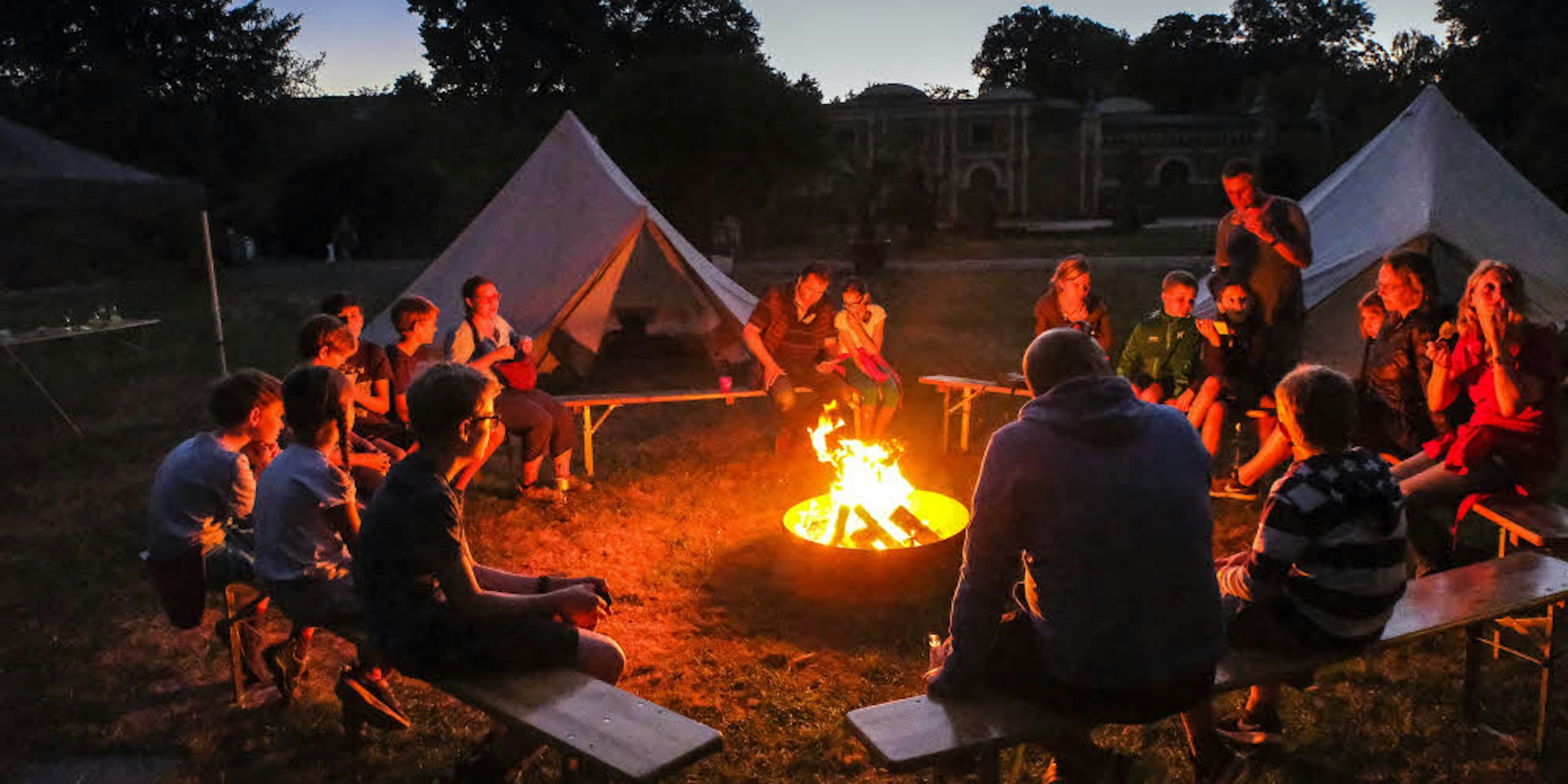 Abendliches Lagerfeuer am Zeltplatz: 24 Kinder und Eltern übernachten im Zoo.