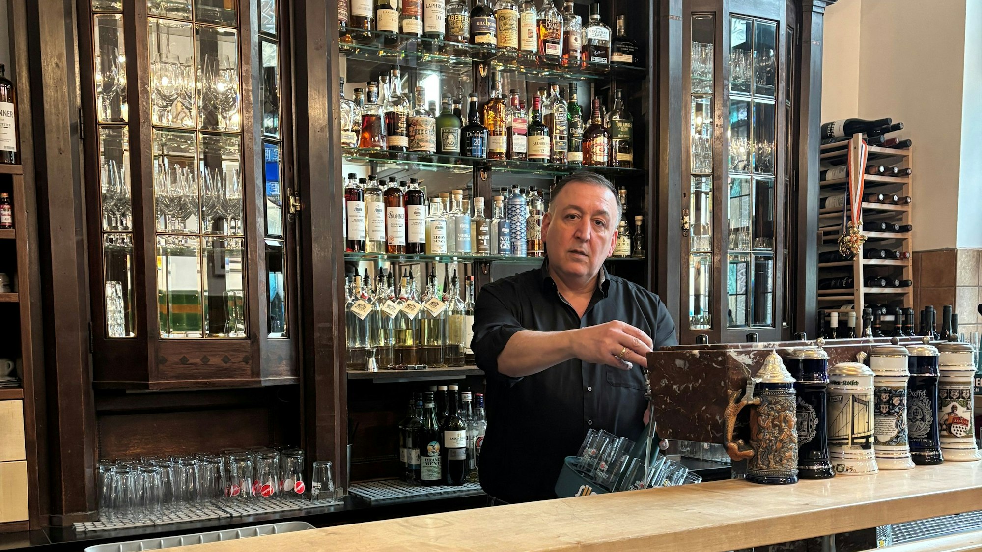 Stefan Grigoriadis hinter der Theke seines Lokals Zum Kornbrenner in Nippes