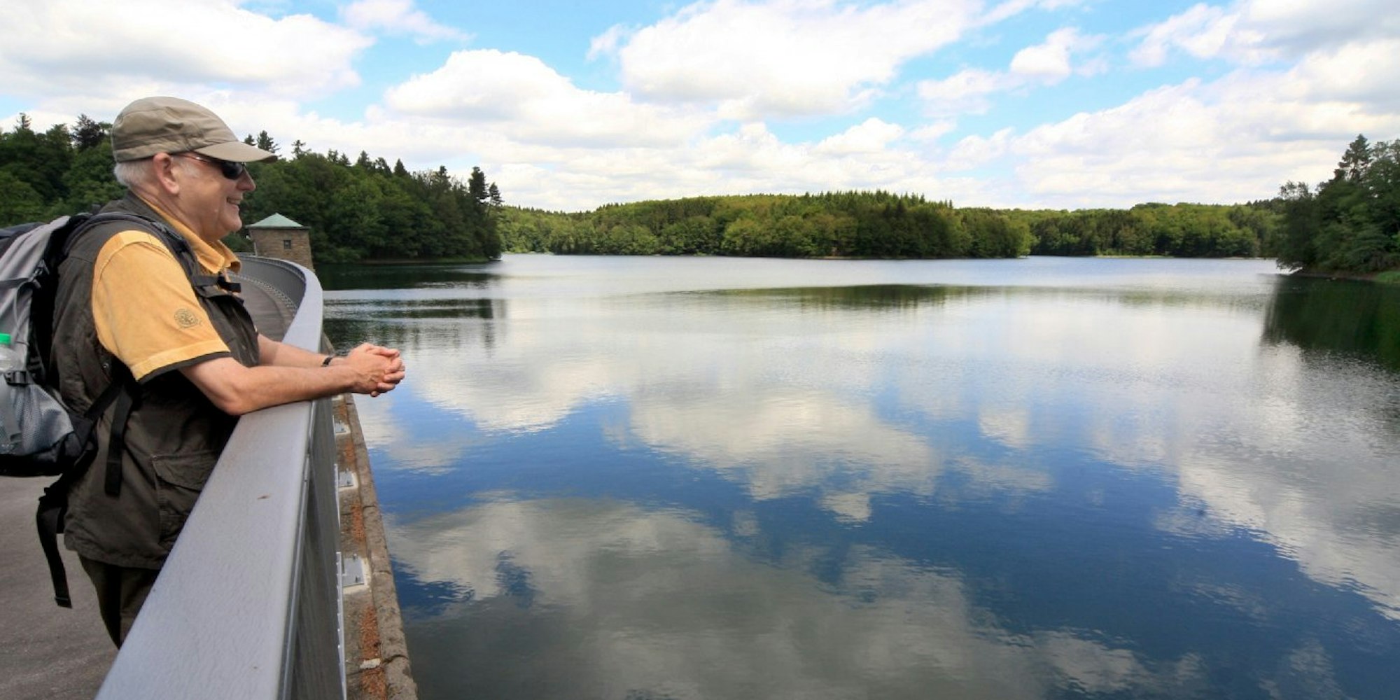 Durch kühlen Wald geht es hinunter an die Neyetalsperre, die vor mehr als hundert Jahren gebaut wurde, um die Stadt Remscheid mit Trinkwasser zu versorgen. Eine gekrümmte Staumauer hält die sechs Millionen Kubikmeter Wasser im Tal zurück. Über die Staumauerkrone geht es auf die andere Talseite und dann der Neye folgend talab.