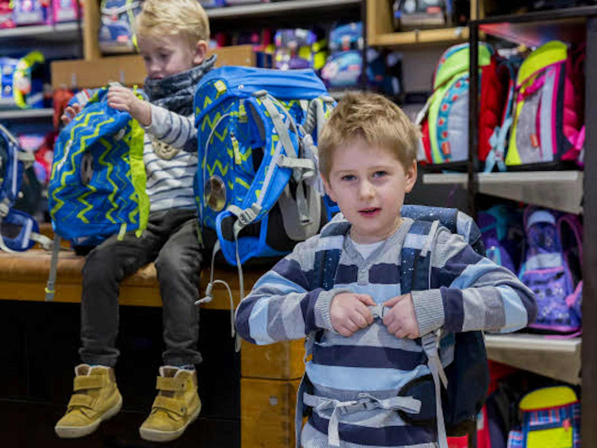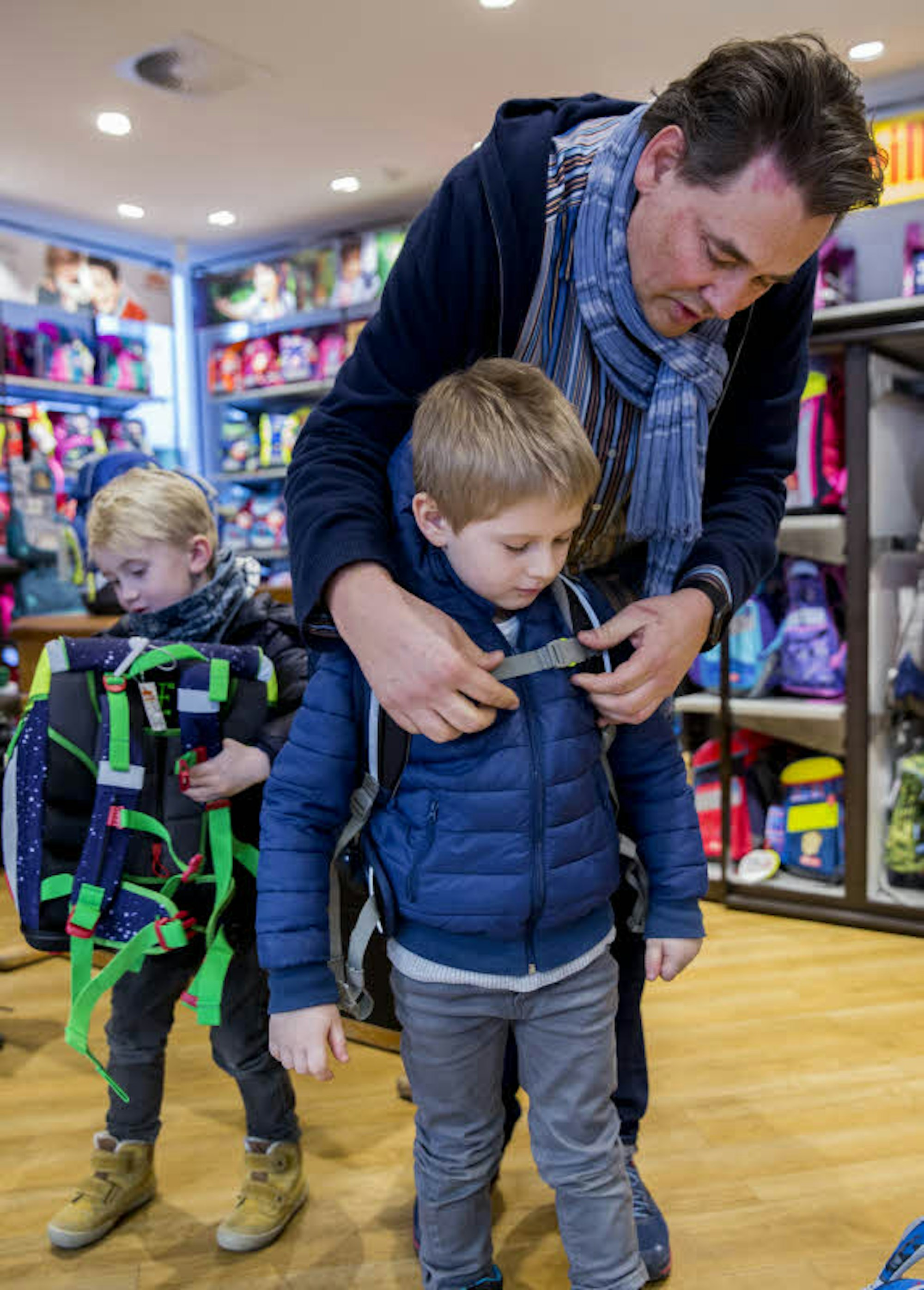 Unsere Jungs wandern die Regale ab und blicken fast ehrfurchtsvoll hinauf auf das riesige Arsenal an Ranzen und Rucksäcken mit Dinos, Delfinen und Drachen. Der Sohn meiner Freundin entscheidet sich schnell: Der blaue Rucksack mit dem Fußball-Motiv soll es sein. Von Ergobag, einem Unternehmen aus Köln-Ehrenfeld, das seit 2010 ergonomische Schulrucksäcke an die Erstklässler bringt. Und das ziemlich erfolgreich. „Inzwischen verkaufen wir etwa 60 Prozent Schulrucksäcke und 40 Prozent feste Schulranzen“, erklärt Geschäftsführer Martin Voegels, der uns heute berät. Aber der Trend gehe momentan wieder hin zur festeren Form. Auch bei den Rucksäcken.