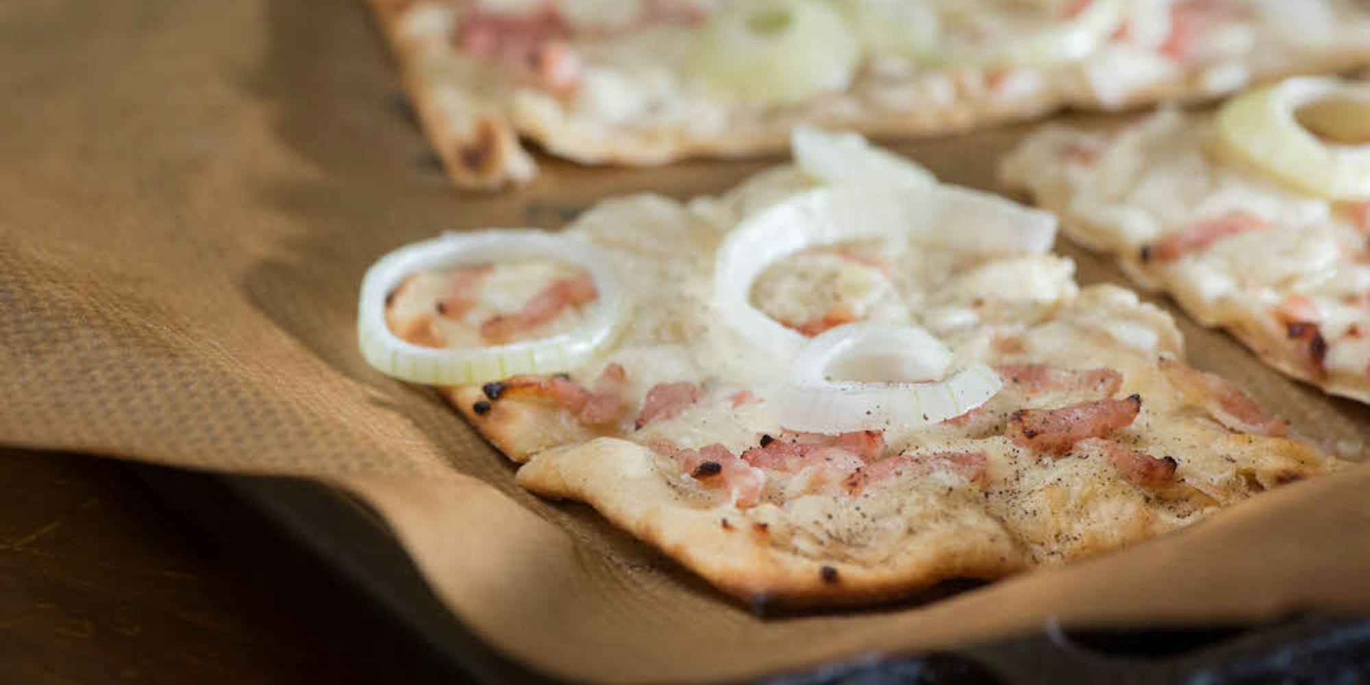Saure Sahne oder Schmand macht sich gut auf Flammkuchen.