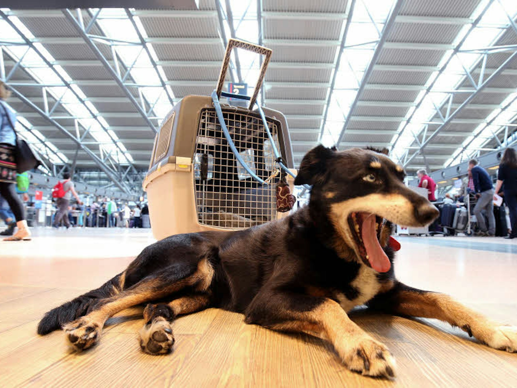 Tier an Bord: Diese Hündin wartet am Flughafen Hamburg auf den Flug nach Kreta.