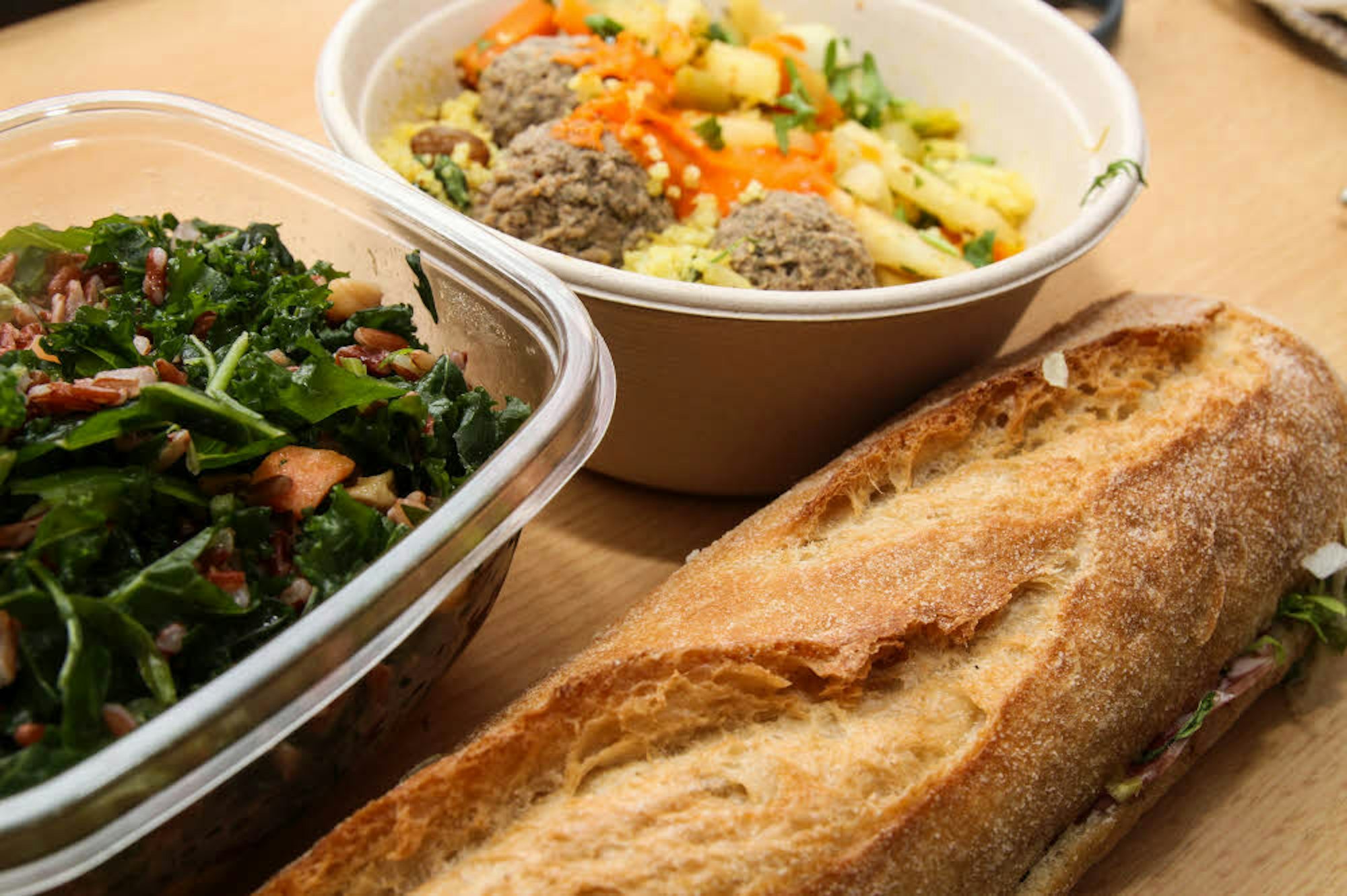 Neben Brötchen aller Art sind auch Croissants übrig geblieben, dazu reichlich Aufschnitt und Rohkost. Als die nette Mitarbeiterin noch einmal die Pancake-Maschine anwirft, ist die Freude groß. Um mein Frühstück nach Hause zu transportieren, bekomme ich wie in den meisten teilnehmenden Läden eine biologisch abbaubare Box aus Zuckerrohr.