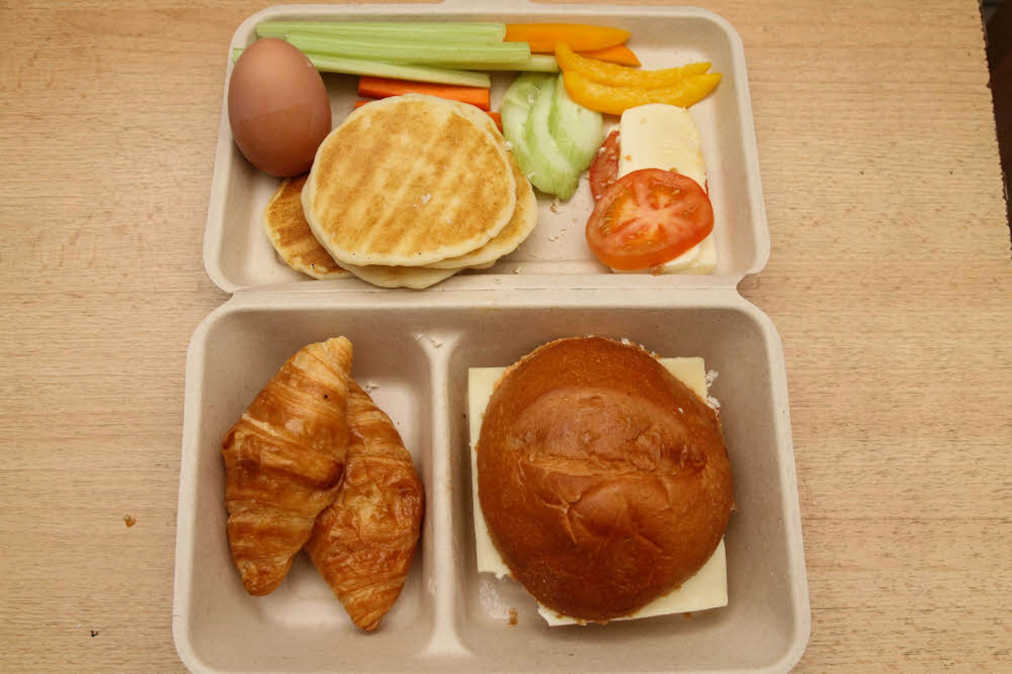 Das Wochenende startet mit Resten des Frühstückbuffets im „Mercure“-Hotel in der Friesenstraße. Die Portion für 3,40 Euro ist bereits zusammengestellt und enthält neben zwei Brötchen und einem Croissant reichlich Aufschnitt und ein Ei.