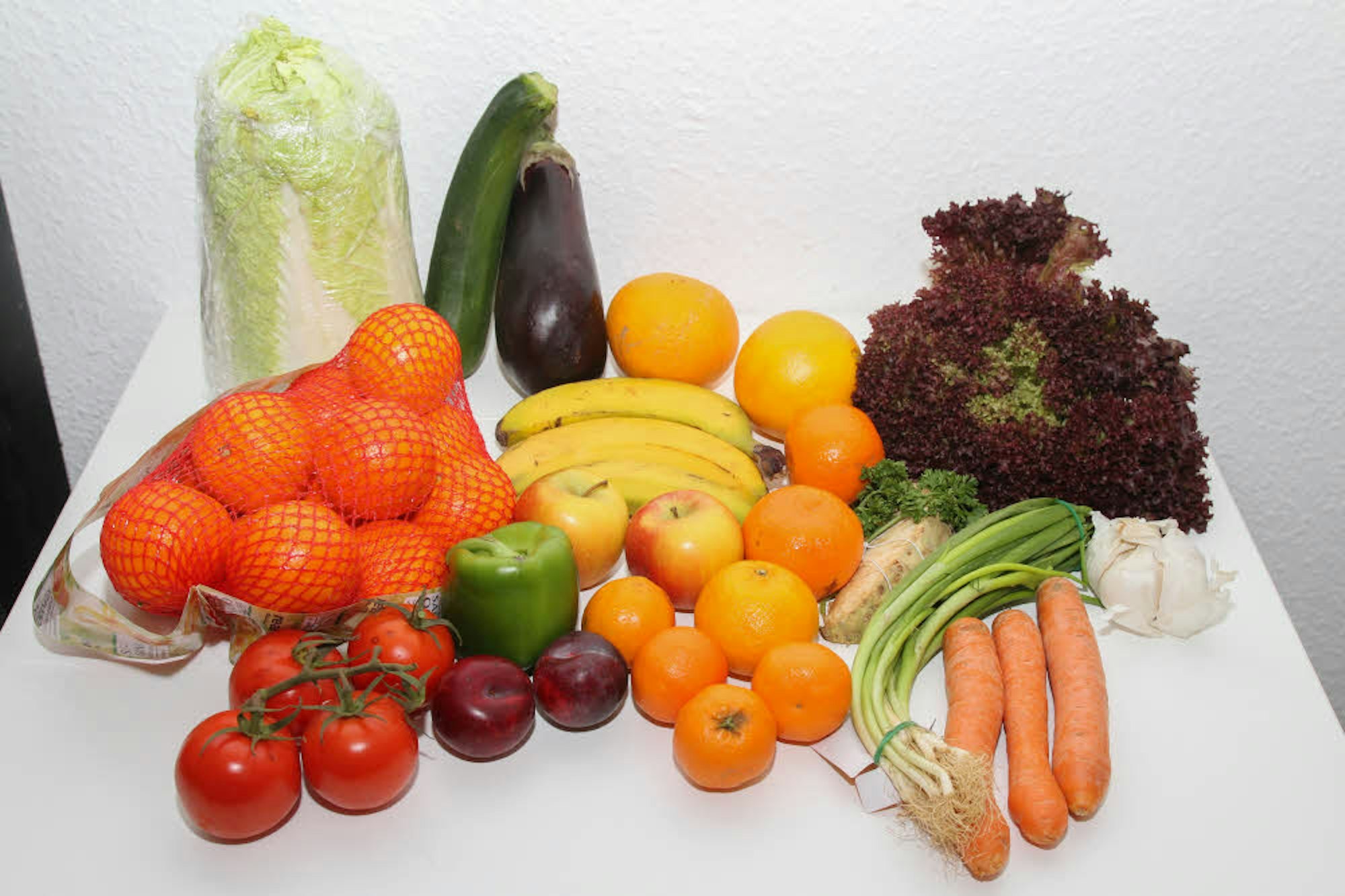Eine prall gefüllte Tüte Obst und Gemüse gibt es von „Real“.