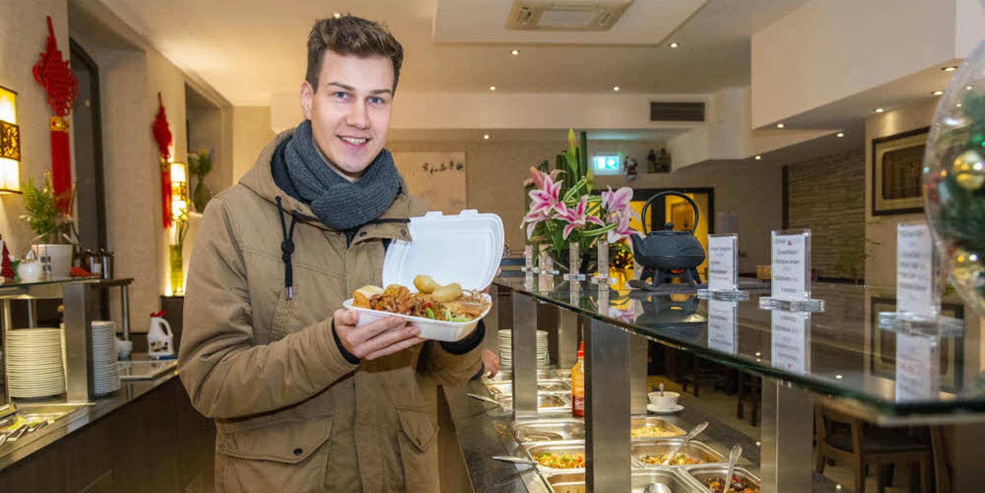 Die Größe der Portion hilft, die die Zeit bis zum Abendessen um 21.30 Uhr zu überbrücken. Im Chinarestaurant „Drachen City“ nahe der Schildergasse räume ich für 3,40 Euro das erste warme Buffet der Woche ab. Natürlich sind nicht mehr alle Speisen so reichhaltig vorhanden wie zwei Stunden früher, aber das erwarte ich als „Too Good To Go“-Kunde auch nicht. „Wir bieten jeden Tag bis zu fünf Portionen an, damit das Buffet am Ende leer ist. Wir sind fast jeden Abend ausverkauft und müssen so kaum Essen wegschmeißen“, erklärt Inhaber Yong Zhang.