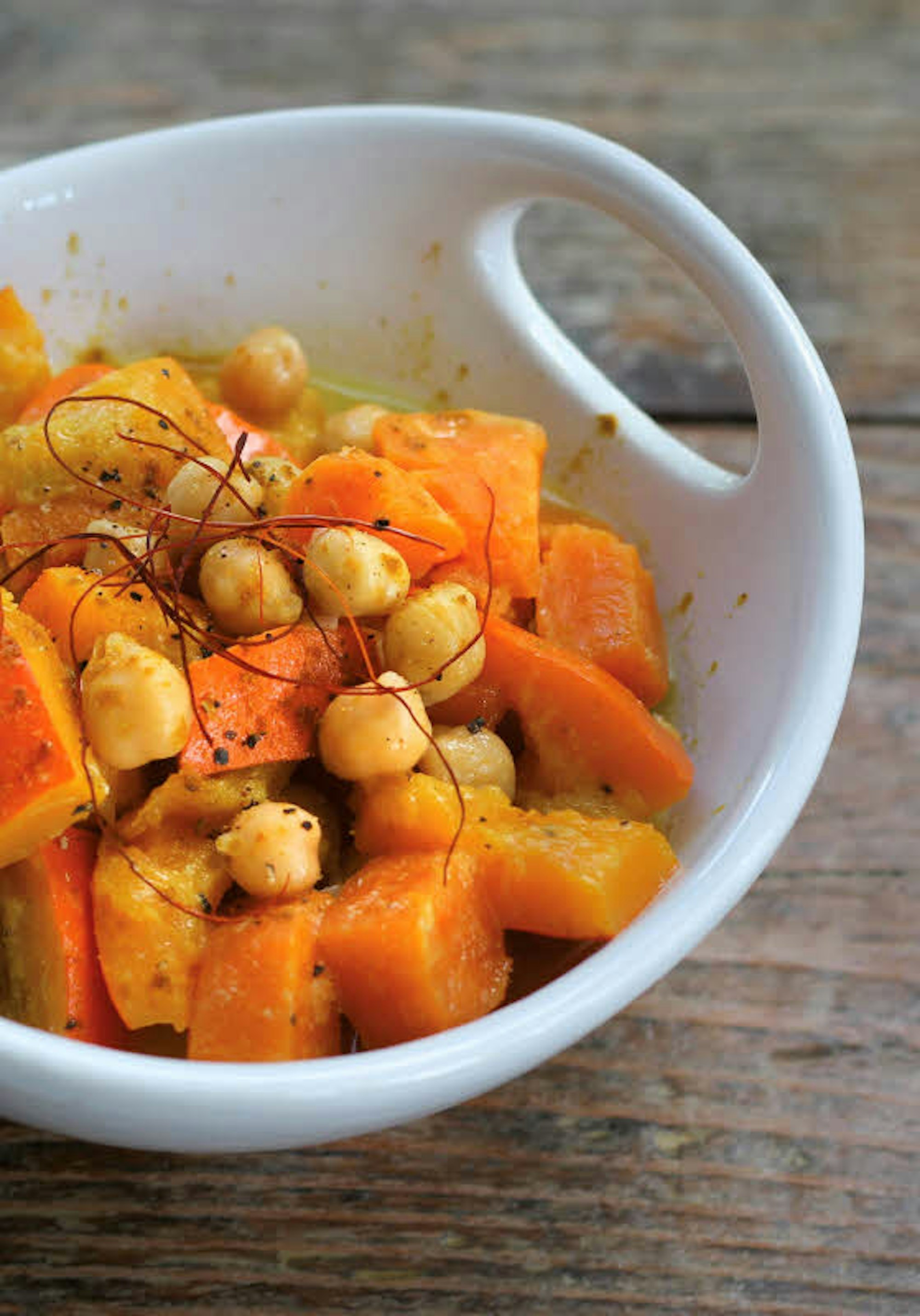 Curry aus Süßkartoffeln, Kürbis und Kichererbsen und Kokosmilch.