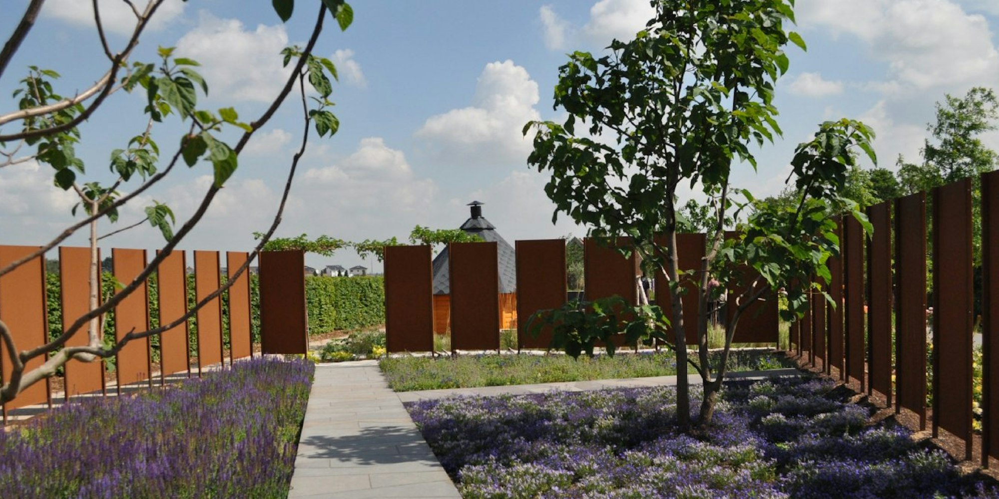 Ganz anders geben sich die modern gestalteten Gärten, etwa der Garten in Blau der Kölner Landschaftsgestalter Jansen und Arens, in dem die Besucher auf Stegen über einen bewegten See aus blau blühenden Stauden gehen. Die tiefvioletten Kerzen des Salbei zum Beispiel heben sich kontrastreich von den Elementen aus rostigem Corten-Stahl ab, die den Garten umgeben.