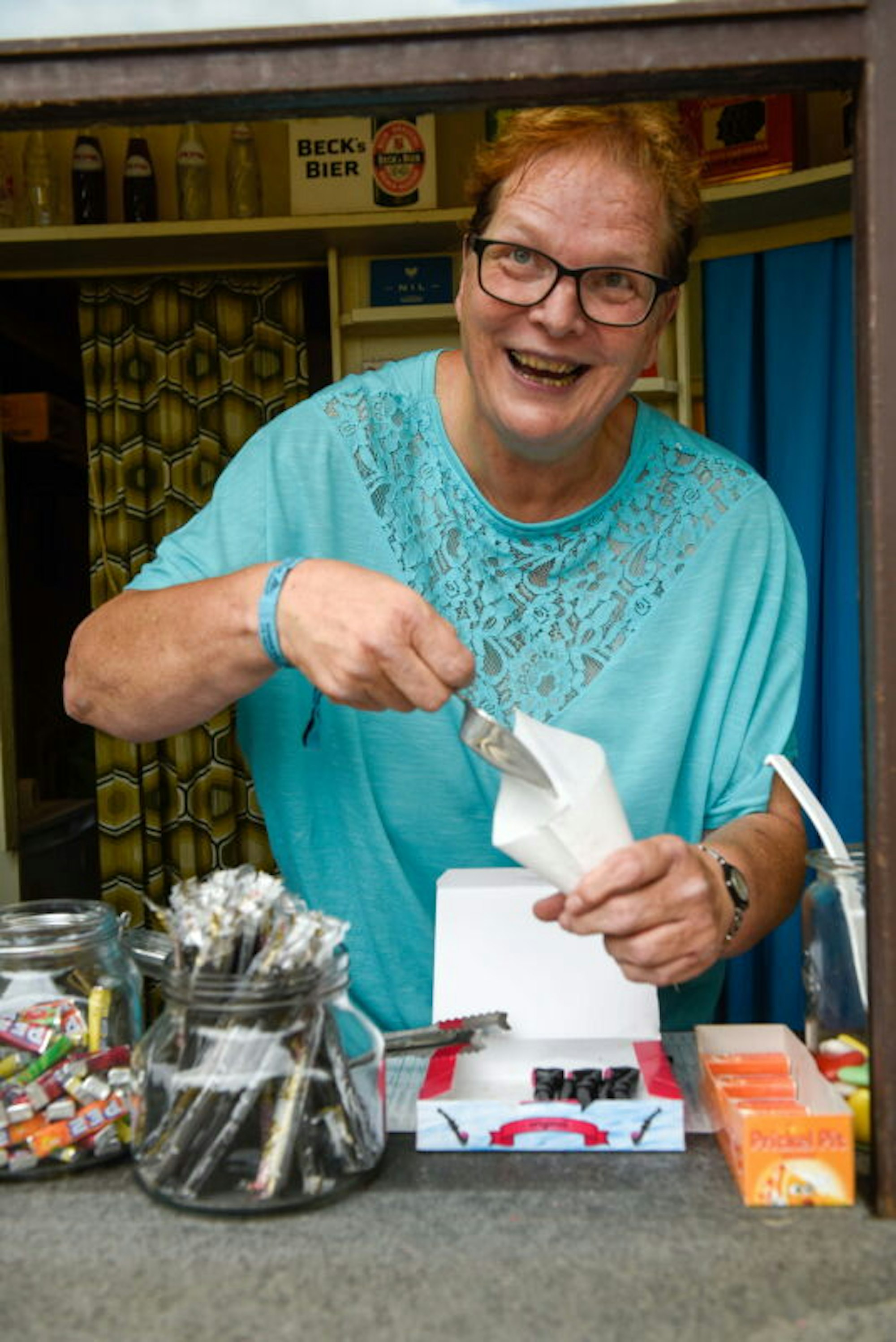 Viele standen Schlange vor dem einstmaligen Kiosk mit Klappfenster zur Brühler Carl-Schurz-Straße hin. Dort löffelte eine Frau mit strahlendem Lachen gebrannte Mandeln, Bonbons und Lakritzpfeifen in Papiertütchen, so wie damals. Ein Griff zu den Schachteln der Zigarettenmarken Juno oder Overstolz im Regal an der Rückwand des Raumes, kaum größer als eine Abstellkammer, blieb freilich vergebens, die Schachteln sind festgeklebt.