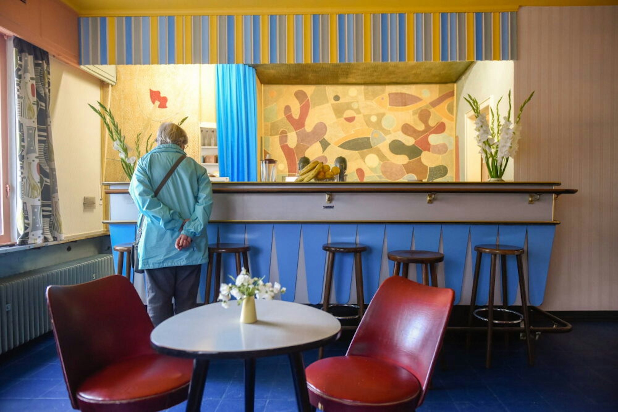 Die Theke erstrahlt im Babyblau der Anfangsjahre, das zuletzt hinter Holzpappe verborgene Wandbild ist wieder freigelegt.
