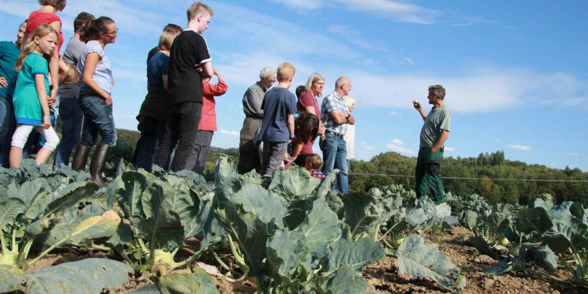 Das geheime Leben von Kohlrabi und Co: Biobauer Bernd Schmitz (rechts) erläuterte, wie Anbau und Ernte auf seinem Gemüsefeld ablaufen.