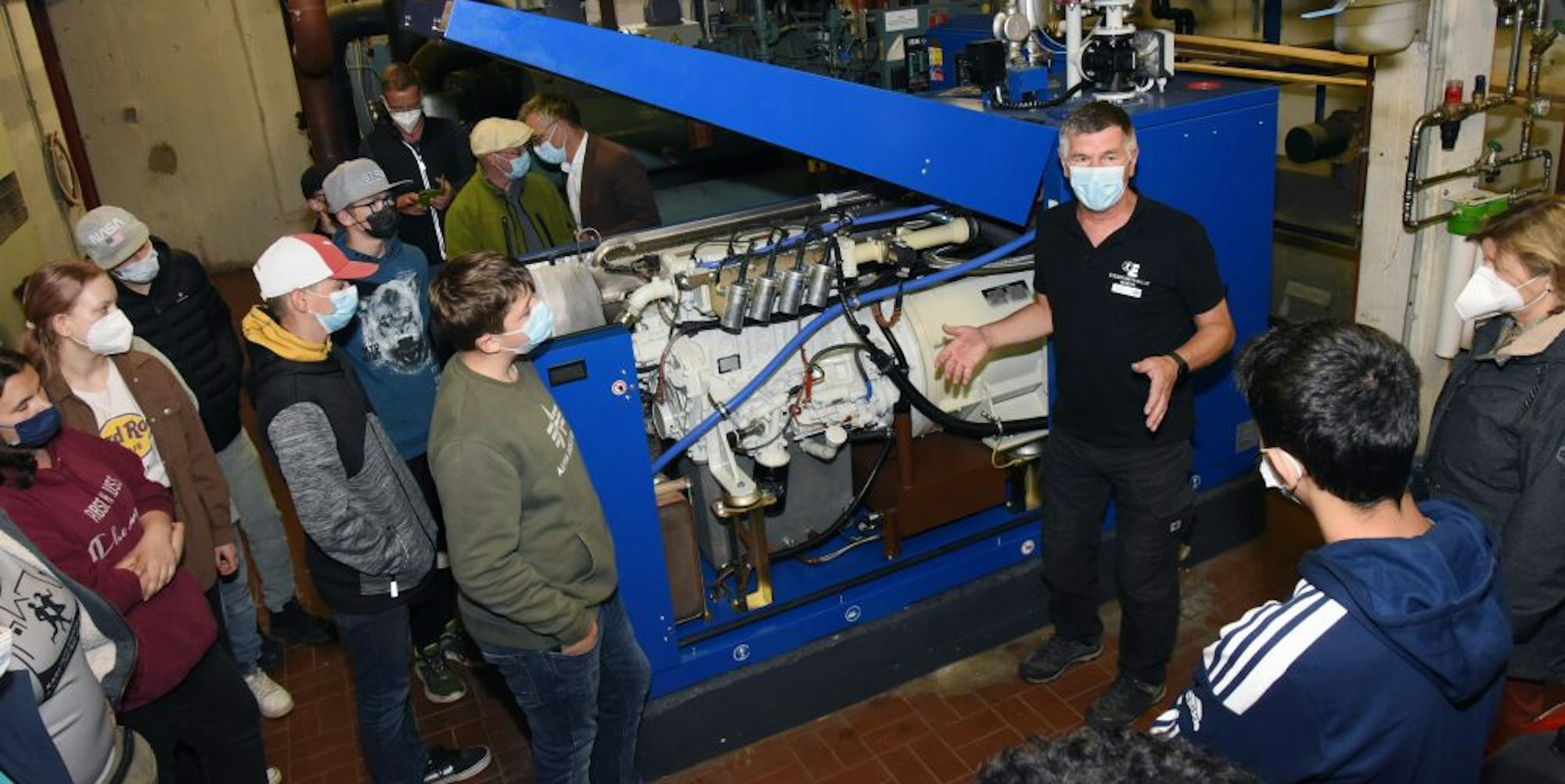 Tief unter der Wiehler Eishalle erklärt Technikchef Jürgen Eisbach den Jugendlichen, wie das Blockheizkraftwerk arbeitet.
