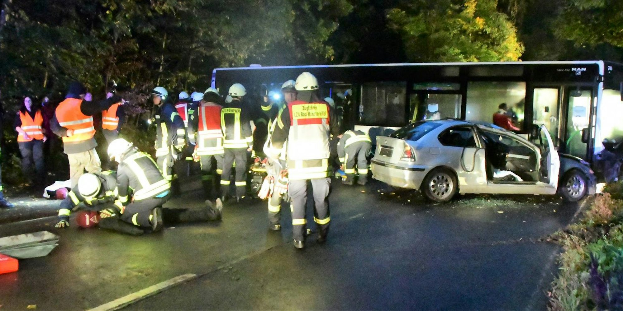 Ein Linienbus stand quer auf der Kreisstraße, ein Auto war in dem Szenario mt ihm kollidiert, ein weiteres lag auf dem Dach.