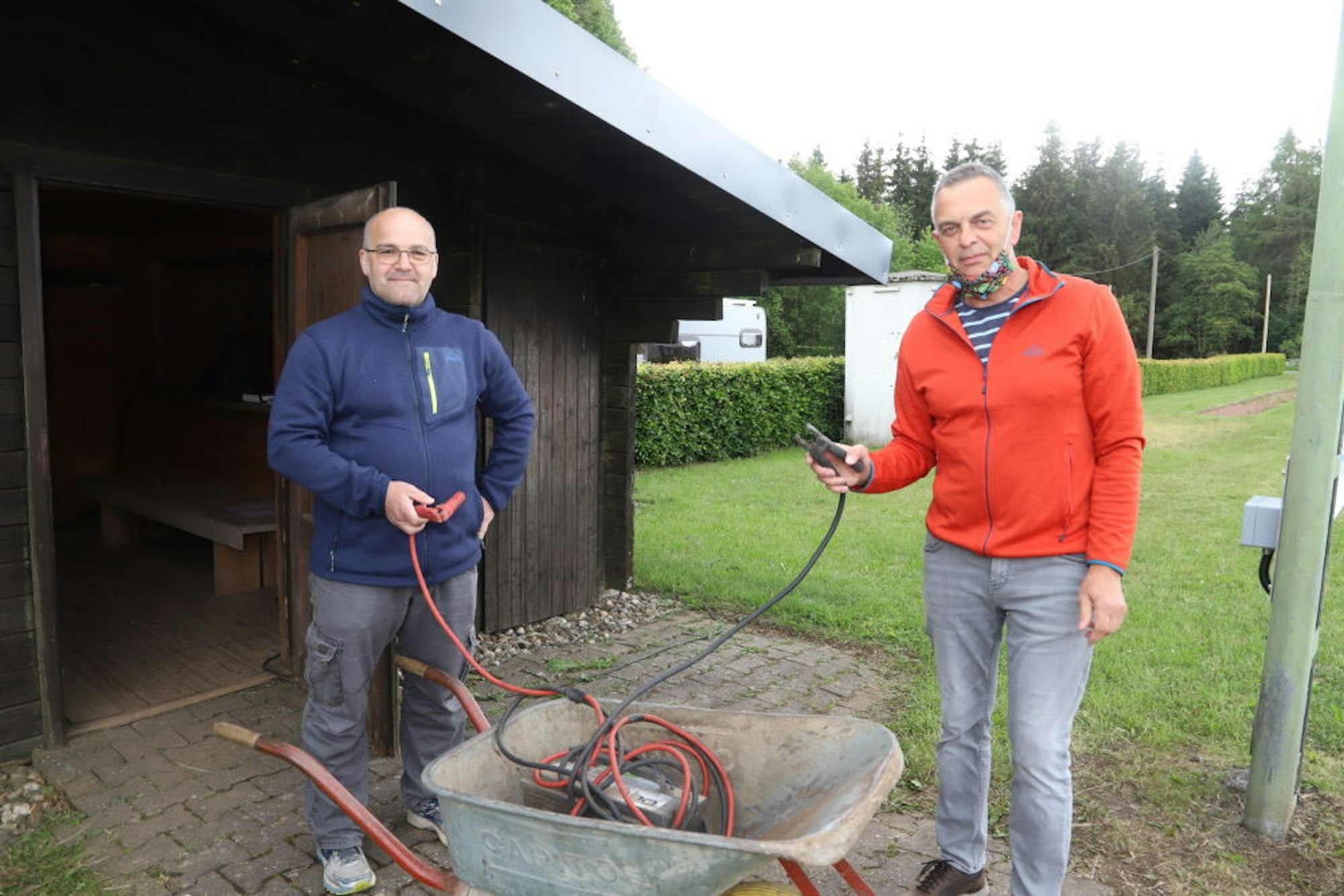 Schnelle Hilfe bei Startproblemen: Rudolf Westerburg (r.) und Andreas Müller mit dem Notfall-Set in der Schubkarre.