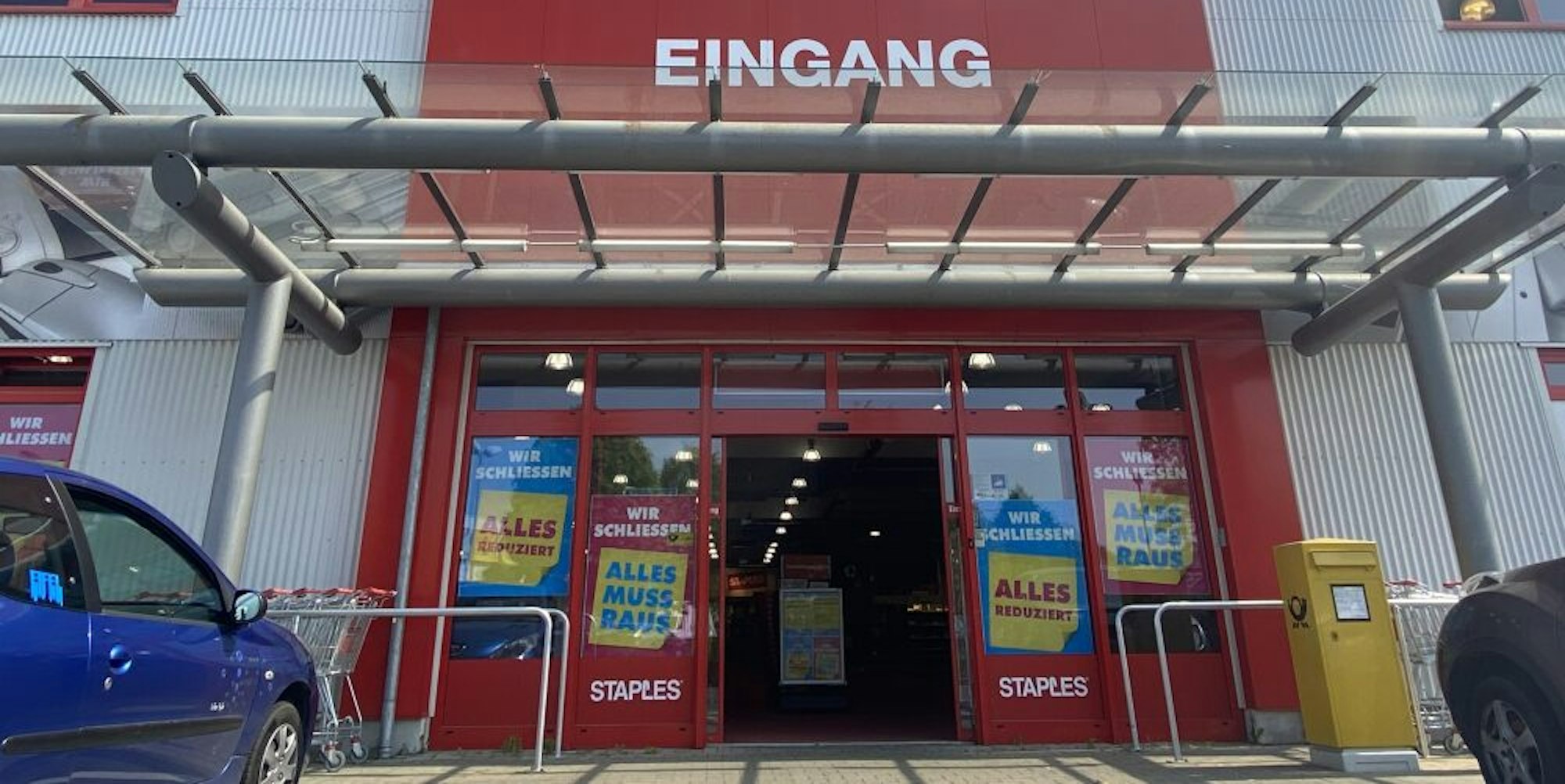 Der Webshop von Staples ist bereits seit dem 29. April geschlossen. Bis zum 30. Juni ist es noch möglich, Geschenkkarten einzulösen. Nicht genutztes Guthaben wird nicht erstattet. Die SB-Kopierer und die Postfilialen stehen bis zum 30. Mai in den Filialen zur Verfügung. So kündigt es das Unternehmen auch auf seiner Internetseite an.