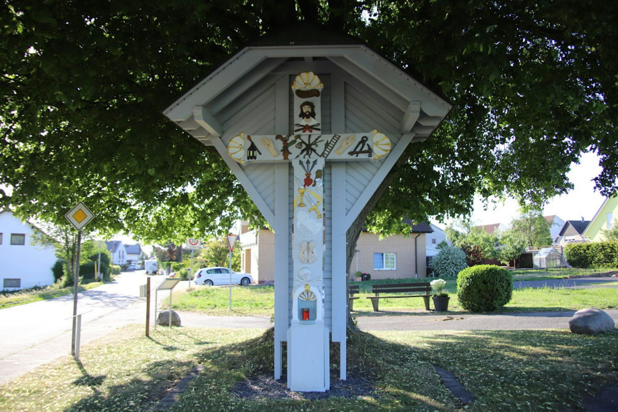 Zwischen Kuppen und Bäumen taucht auch der Ölberg auf, ein Blick zurück geht weit ins Rheintal. Am anderen Ende von Algert findet sich das Arma-Christi-Kreuz, Darstellung der „Waffen des Herrn“. Die schöne Schnitzarbeit entstand wohl zwischen 1790 und 1800. Hier ist Wendepunkt. Wer mag, kann hier aber auch noch die 6,5 Kilometer lange Denkmal-Tour anhängen.
