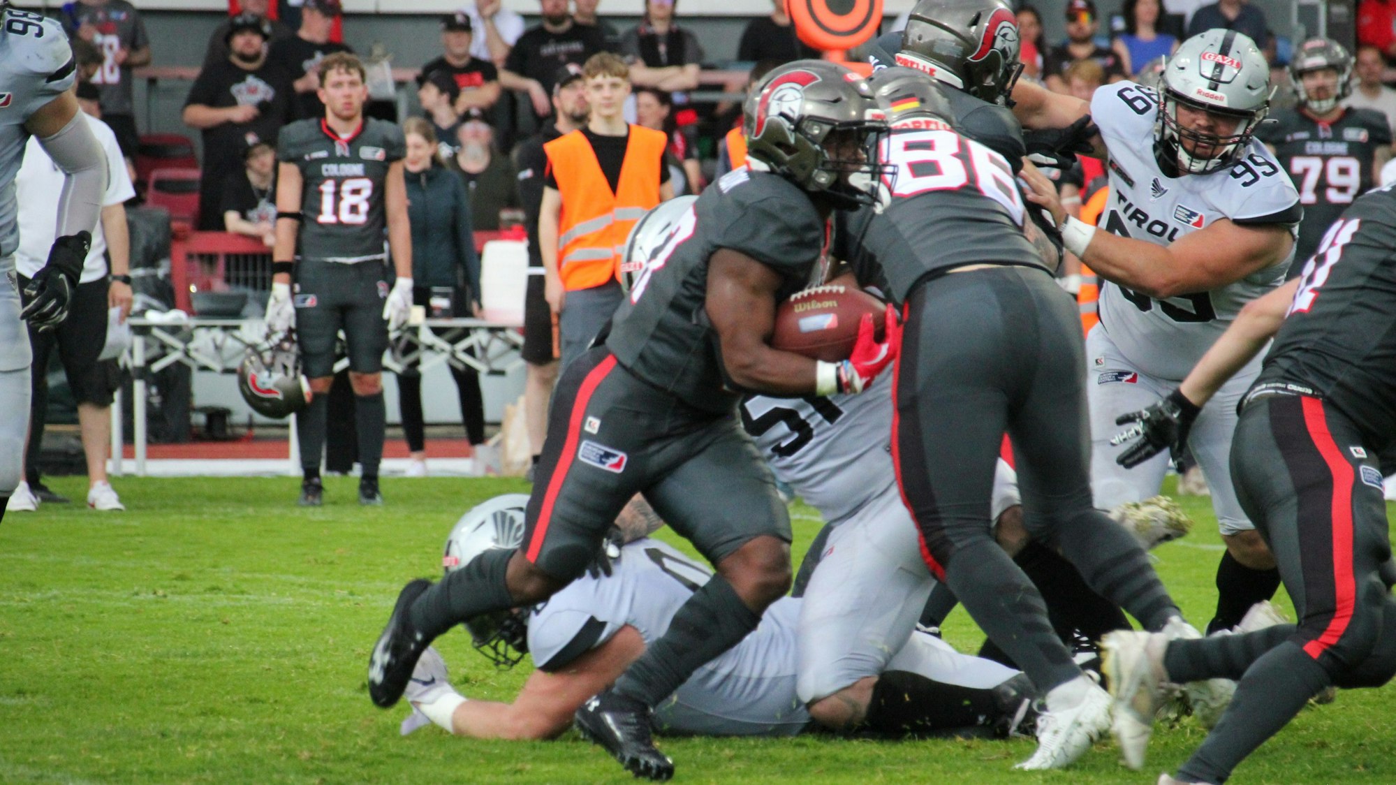 Die Blitze zuckten noch in der Ferne am Himmel, während auf dem Platz ein Touchdown nach dem anderen einschlug – zum Leidwesen der Kölner Fans allerdings kein einziger für die Kölner. Weil US-Quarterback Connor Miller verletzt ausfiel, übernahm Adrian Platzgummer die Rolle des Spielmachers für Tirol und zeigte eine starke Leistung. Tobias Bonatti, Marco Schneider, Lukas Haslwanter und JaCorey Sullivan sorgten mit ihren Touchdowns zur Pause für klare Verhältnisse. Insgesamt neun Touchdowns und zwei Field Goals erzielten die Raiders gegen hoffnungslos unterlegene Centurions, die sich nicht nur im Defensiv-Verhalten einige katastrophale Fehler erlaubten.