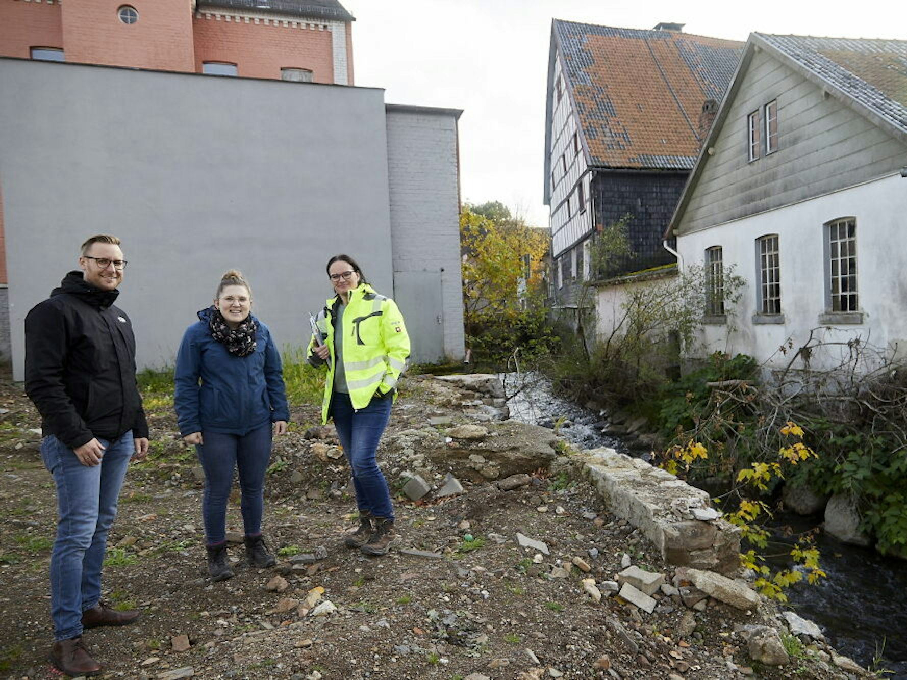 Das Ufer des Reifferscheider Bachs in Blumenthal inspizieren Martin Berners, Maria Hanf und Carmen Manderfeld.