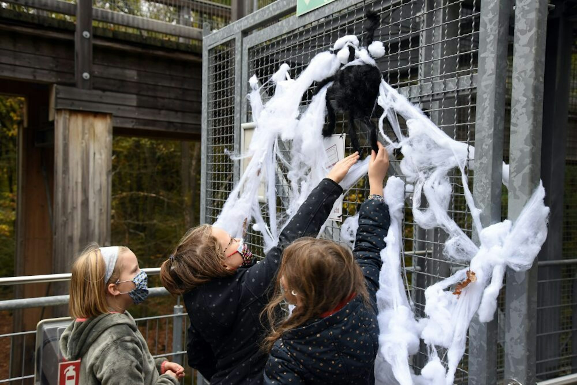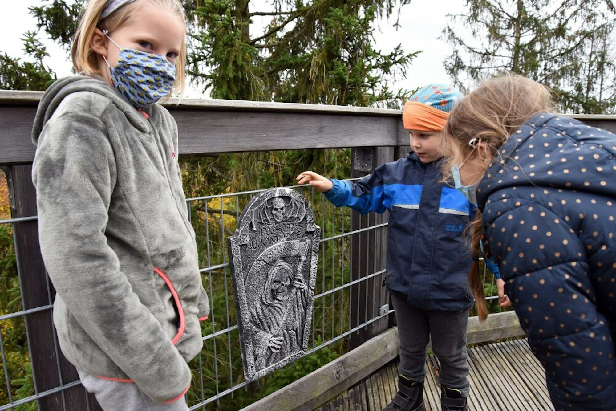 „Die Kinder sollen sich gruseln, aber nicht ängstigen“, betont Mielke, der sich im vergangenen Jahr erstmals solche Rundgänge ausgedacht hat. Da hatte sich Panarbora vor Halloween in einen Geisterpark verwandelt. Weil 2020 aber alles anders ist, gibt es diesmal nur die rund anderthalbstündigen Touren. „Wir hoffen in dieser schweren Zeit auf etwas andere Unterhaltung“, sagt etwa Thomas Bein aus Berlin, der mit Tochter Jule (8) unterwegs ist. 1635 Meter Baumwipfelpfad und schaurig-schöne, skurrile, fantastische und auch ein wenig makabere Geschichten liegen vor Vater und Tochter. Die vom bösen Stinkevogel ist nur eine davon.