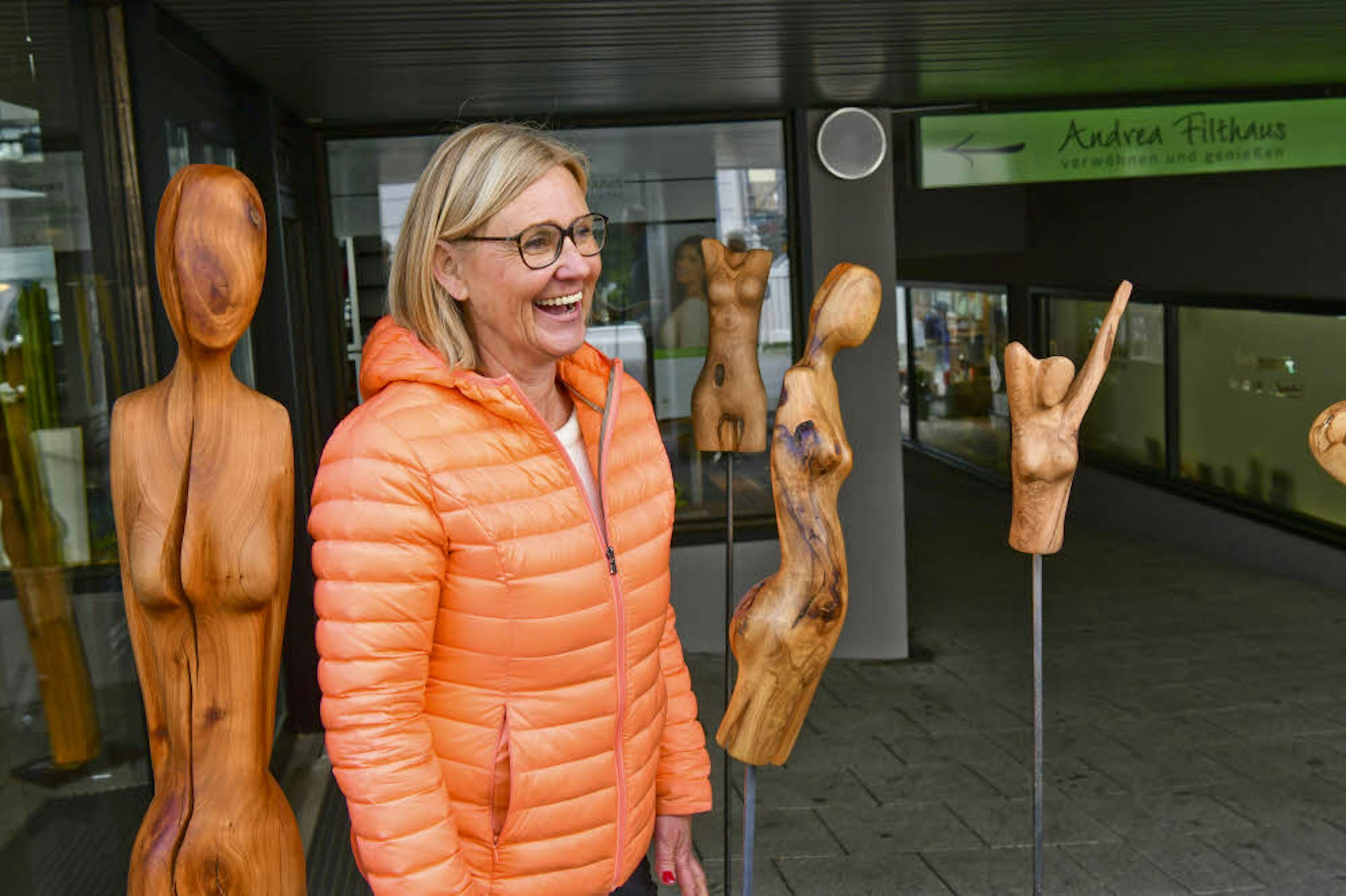 In Luzia Scharmanns Acrylbildern strahlten Kohlmeisen und Lilien die Besucher an. Ein paar Meter weiter hielten sich Buchbinder Markus Heibach und seine Damen vom Morsbacher Kunstwerk 66 die Kälte mit Decken vom Leibe. Vera Rührup berichtete, dass sie einige Bilder schon vor einem kleinen Wassereinbruch ins Zelt retten mussten. Sich selbst künstlerisch betätigen konnte, wer am Stand der Gummersbacher VHS vorbeiguckte: Dort – unter einem Heizpilz – durften Buttons nach eigenem Gusto gestaltet werden. Aus Nümbrecht hatte Christiane Lefherz ihre Skulpturen auf die Wilhelmstraße mitgebracht. „Hier beim Frühlingsfest auszustellen, ist eine tolle Gelegenheit“, freute sich die Bildhauerin: „Die Menschen sind trotz Kälte locker drauf.“