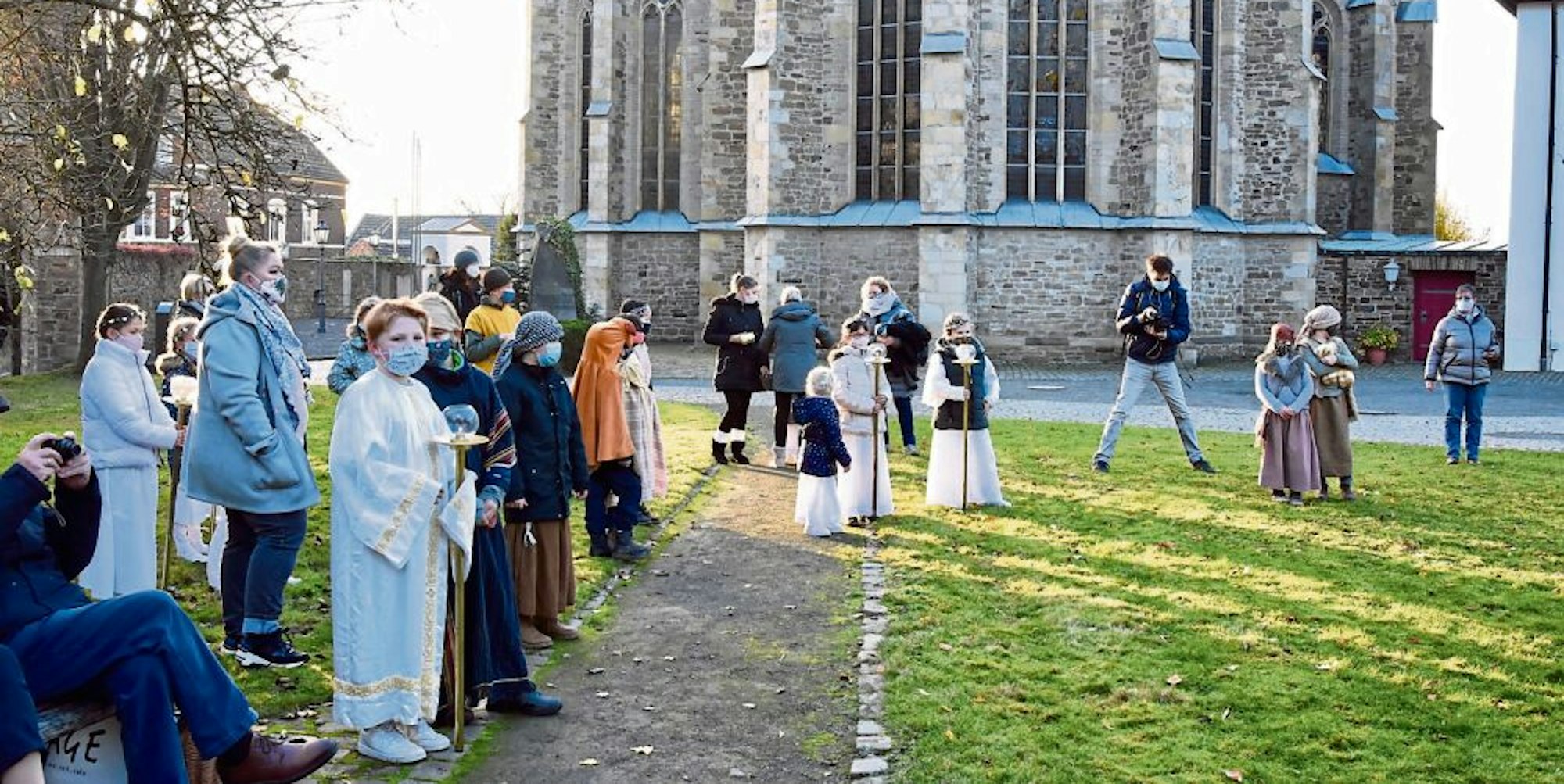 Im Garten der Wallfahrtskirche Bödingen hieß es am Samstag für die Krippenszene zum letzten Mal: „Kamera läuft.“ Zunächst ließen die Macher alle 22 Darstellerinnen und Darsteller für die Aufnahme des Abspanns in Reihe antreten. Für das finale Filmgruppenbild flog eine Drohne an der Protagonisten-Phalanx vorbei und fing die Gesichter ein, denen Glück und Stolz anzusehen war. Und das zu Recht, denn Rönn-Rieck und Müller-Goldkuhle, die sich das Regieamt hinsichtlich der mimischen und filmischen Aspekte teilten, waren „begeistert und erstaunt“ über die Unbefangenheit, Spielfreude und vor allem die Geduld der Kinder während der Dreharbeiten.