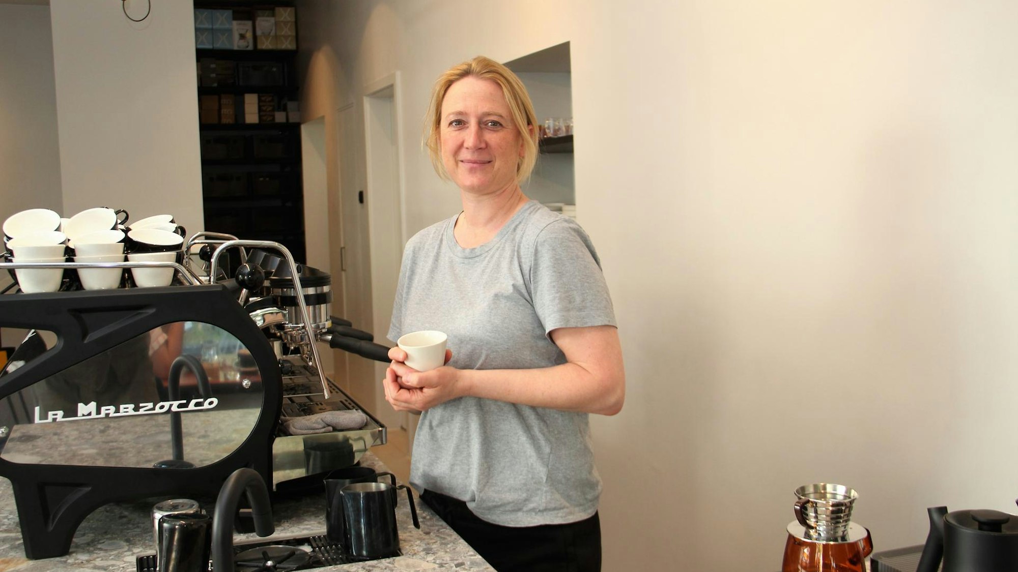 Barista Maren Ernst an der Bar ihres Kaffees im Weyertal.