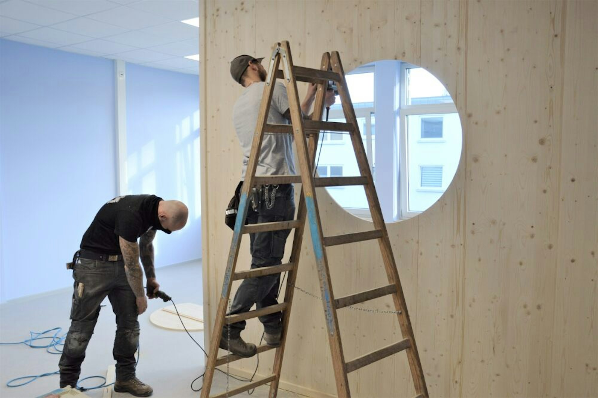 An verschiedenen Stellen werden noch letzte Arbeiten erledigt.