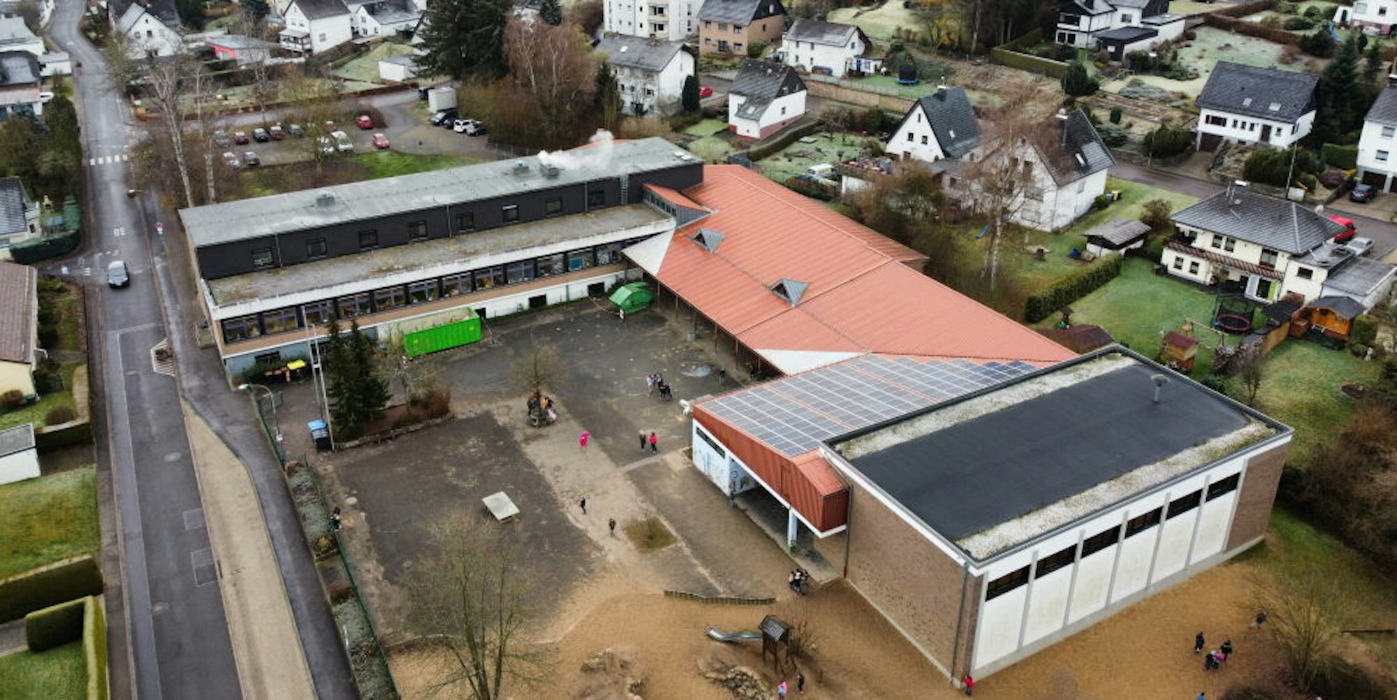 Für den ehemaligen Grundschulstandort in der Auelstraße haben Investoren ein Konzept mit Wohnungen für alle Altersklassen und einer Pflegeeinrichtung vorgelegt. Die Turnhalle (vorne r.) soll erhalten bleiben.