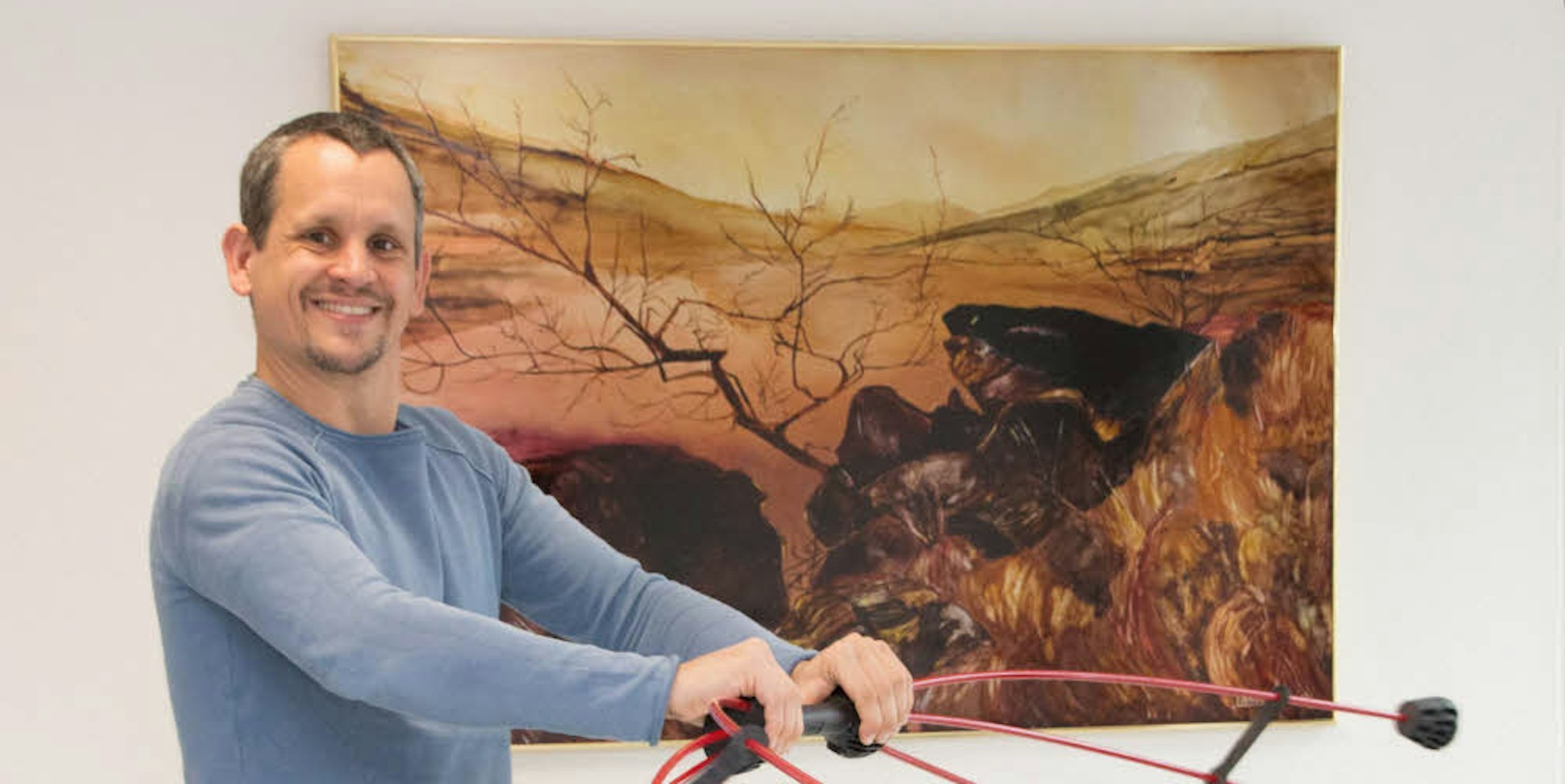 Christoph Hillers nutzt den „XBar3“, das erste eigene Produkt des Unternehmens, für aktive Pausen im Arbeitsalltag. )