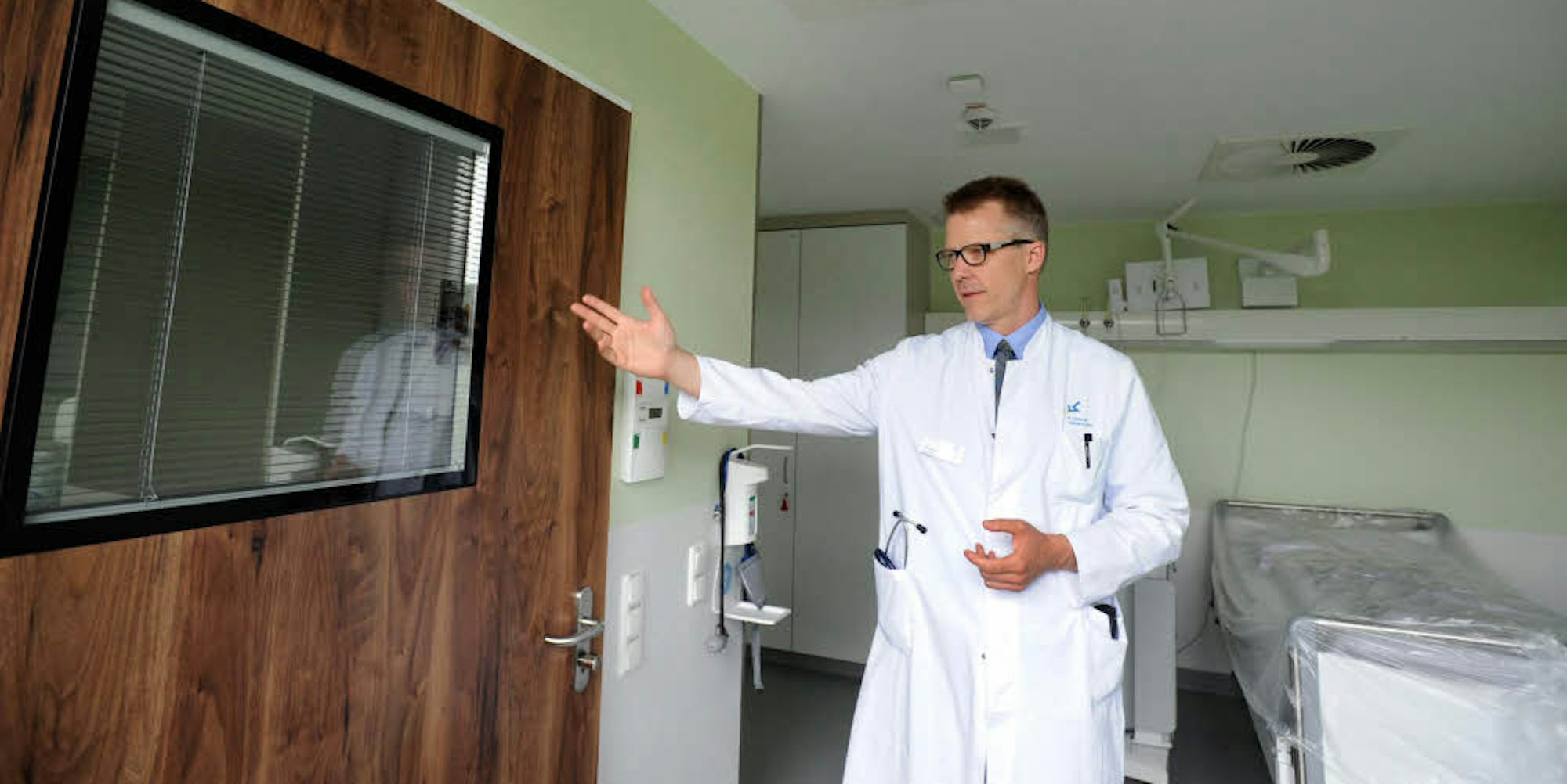 Reuter ist stolz auf seine Station, die er selbst mit konzipiert und bei der geplanten Aufstockung des Klinikum-Hauptgebäudes durchgesetzt hat. Sie hat die zweithöchste Sicherheitsstufe B+, höher eingestuft ist in NRW nur die Spezialisolierstation in der Uniklinik Düsseldorf, die Reuter ebenfalls mit entworfen hat. „Die ganz schweren Fälle wie etwa Ebola, bei denen die Ärzte sich diese Raumanzüge anziehen müssen, können wir hier nicht behandeln, aber alles aus der zweithöchsten Kategorie können wir aufnehmen.“ Dazu zählen zum Beispiel Masern und Tuberkulose, beides Erkrankungen, die auf seiner Station regelmäßig behandelt werden müssen. „Einen Masernfall hatten wir gerade erst letzte Woche wieder“, sagt Reuter – und appelliert an alle, ihren Impfschutz zu überprüfen und gegebenenfalls nachzubessern.