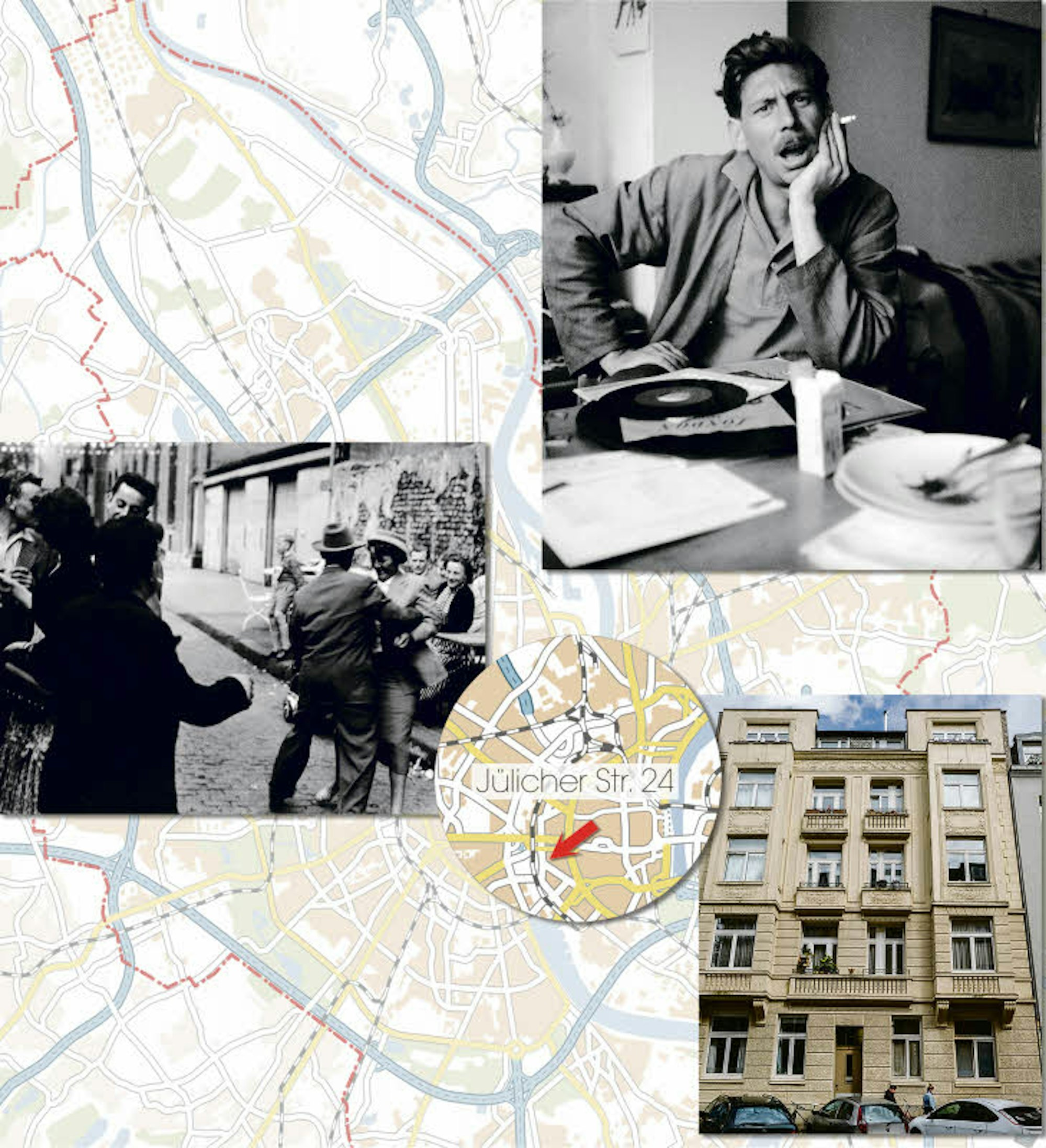 Ein Rebell, der seine Bilder sprechen ließ: Carl Heinz Hargesheimer, besser bekannt als Chargesheimer (o.r.), zeigte Köln nüchtern und ungeschönt. Etwa in dem Buch „Unter Krahnenbäumen“ (l.) . In seinem Haus an der Jülicher Straße 24 (r.) starb er in der Silvesternacht 1971.