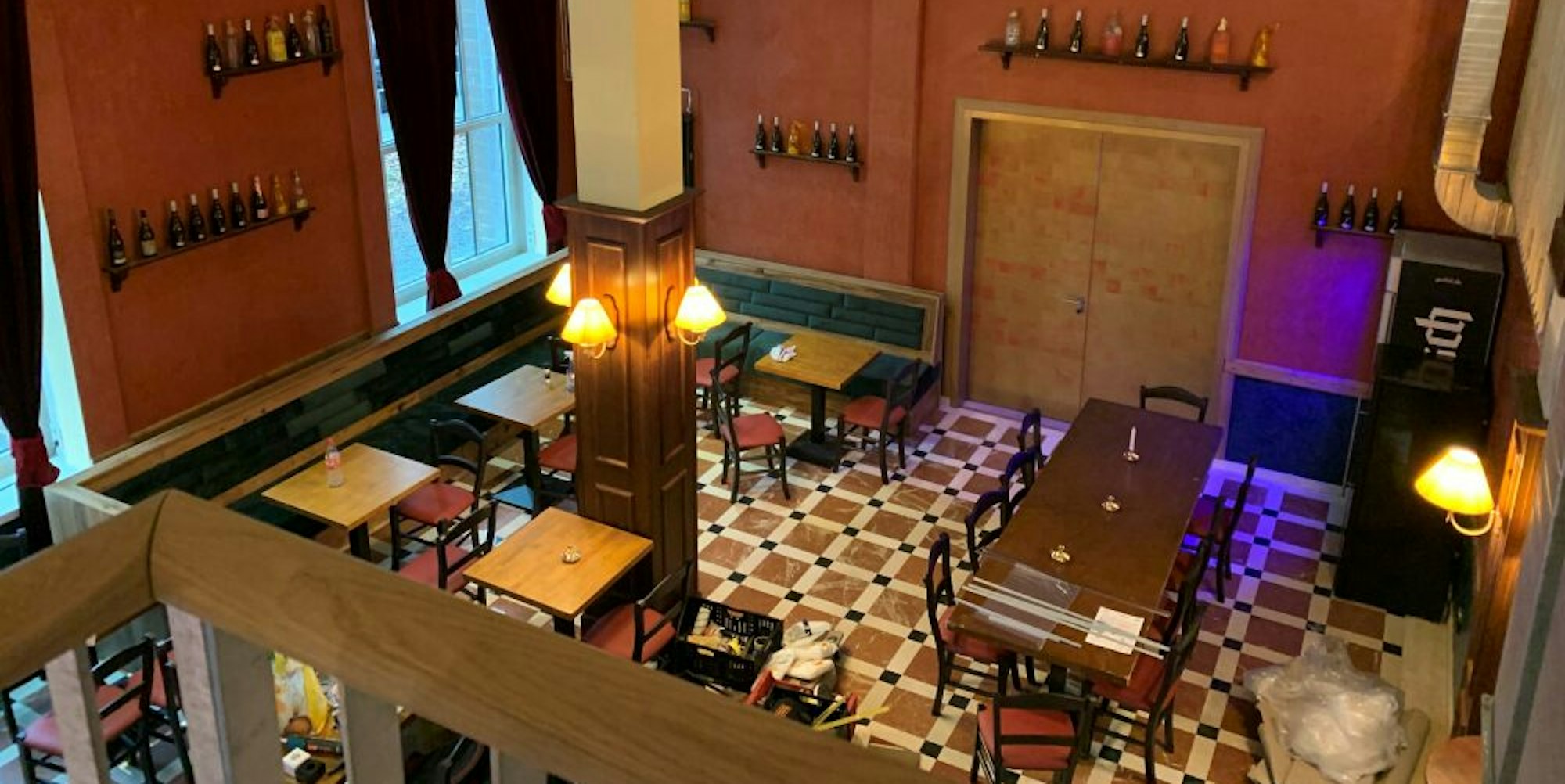 In dem 5,40 Meter hohen Raum ist man der traditionellen Atmosphäre treu geblieben, erzeugt durch schwere Samt-Gardinen vor meterhohen Fenstern und einer Einrichtung in rostroten Tönen mit vielen Holzelementen und einem auffälligen Marmorboden. Auch die Fresken an den hohen Decken sind als Markenzeichen der Restaurant-Kette erhalten geblieben. Zum Konzept gehören außerdem eine große Bar in der Mitte des Saals und die transparente Show-Küche samt italienischem Stein-Ofen.