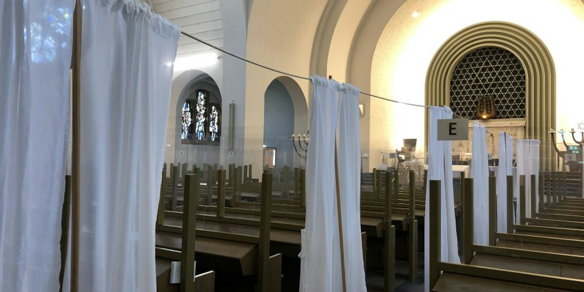 Die Synagoge an der Roonstraße, wegen der Pandemie, derzeit wegen der Pandemie mit Tüchern „geteilt“, ist das Zentrum auch des sozialen Engagements.