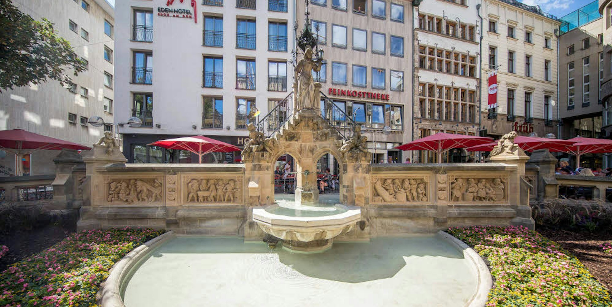 Die Reliefplatten (zwei links, zwei rechts) sind ausgetauscht worden und sollen nun besser dem Kölner Wetter trotzen.