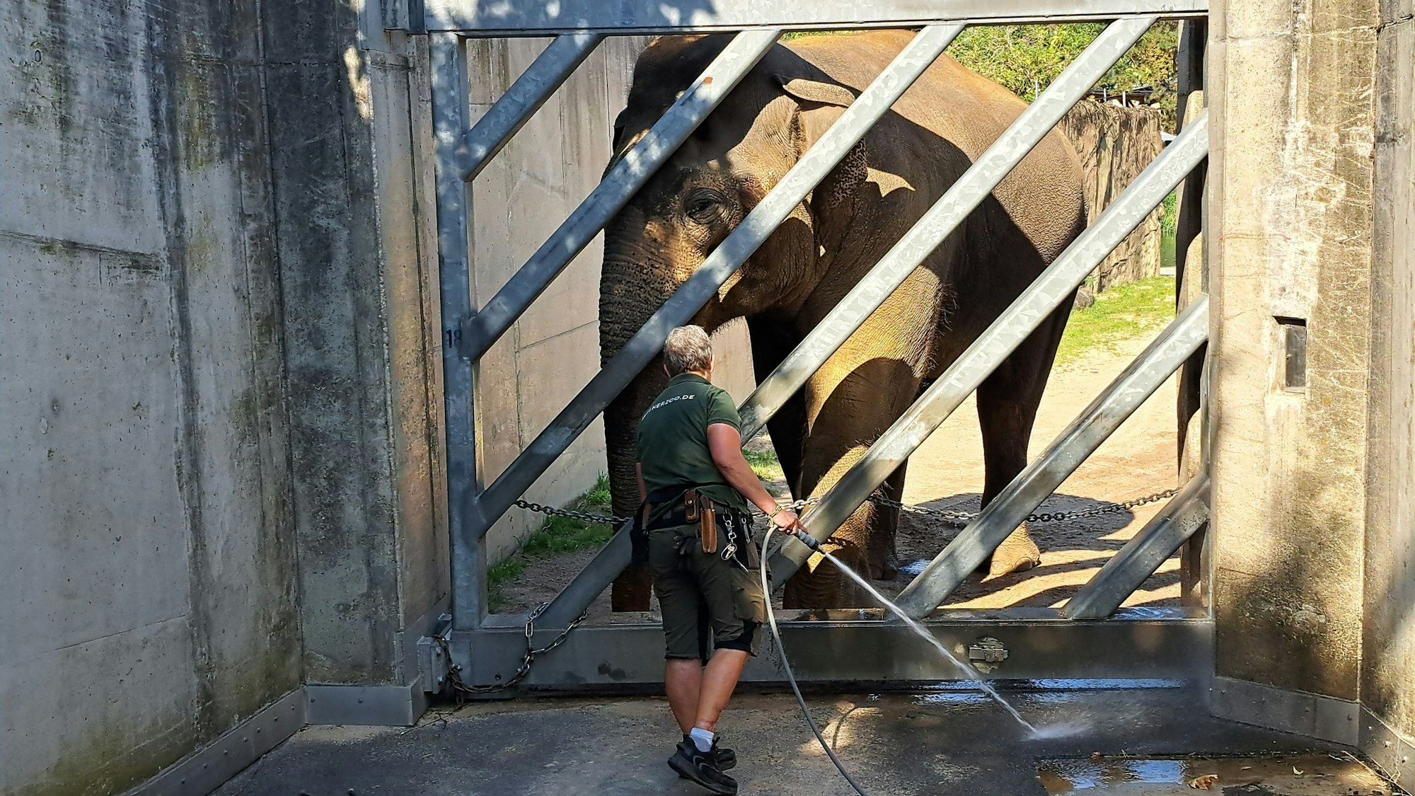 Bei dem Umgang mit den Tieren setzt der Zoo auf das „Protected contact“-Prinzip. Die Elefanten leben im normalen Herdenverband ohne direkten Kontakt zu den Tierpflegenden. Einmal täglich durchlaufen die Elefanten eine Kontrolle, bei der sich die Mitarbeitenden des Zoos die Füße anschauen oder Blut abnehmen. Darüber hinaus trainieren sie mit den Elefanten - nicht zur Belustigung des Publikums, sondern als Beschäftigung für die Tiere, wie Ingrid Wallner, Leiterin des Elefantenparks, erklärt. Die Tierpflegerin arbeitet bereits seit 45 Jahren im Zoo. Denn die sind in der freien Wildbahn bis zu 18 Stunden täglich unterwegs und möchten aktiv sein.