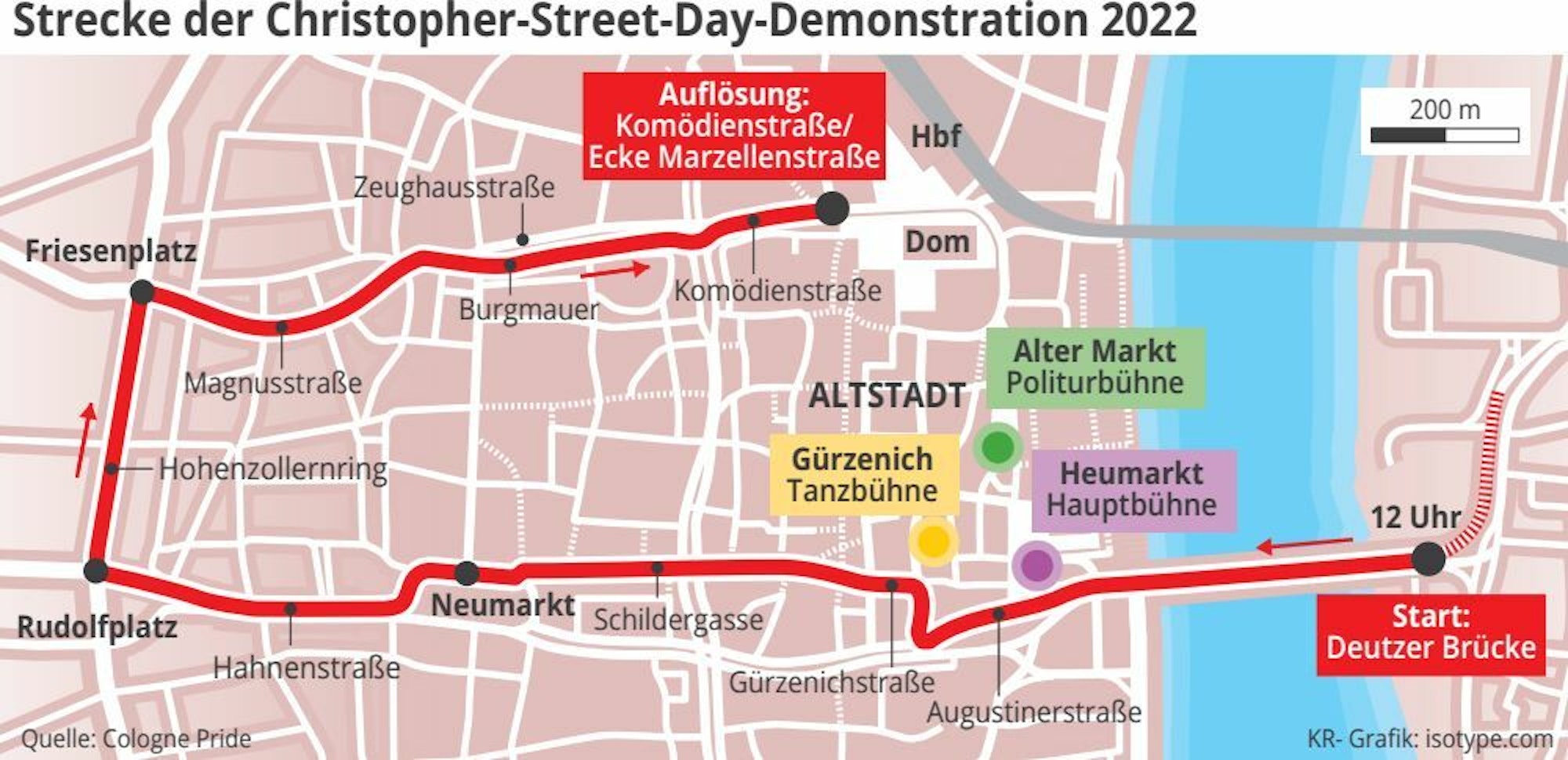 Viele Hunderttausend Besucher werden bei der CSD-Parade, dem Höhepunkt des Christopher Street Days, am Sonntag, 3. Juli, erwartet. Beginn ist um 12 Uhr. Rund sechs Stunden zieht die Demonstration dann durch die Innenstadt. Dabei geht es erstmals über den Rudolfplatz, weil die − jetzt autofreie − Ehrenstraße zu eng geworden ist.
