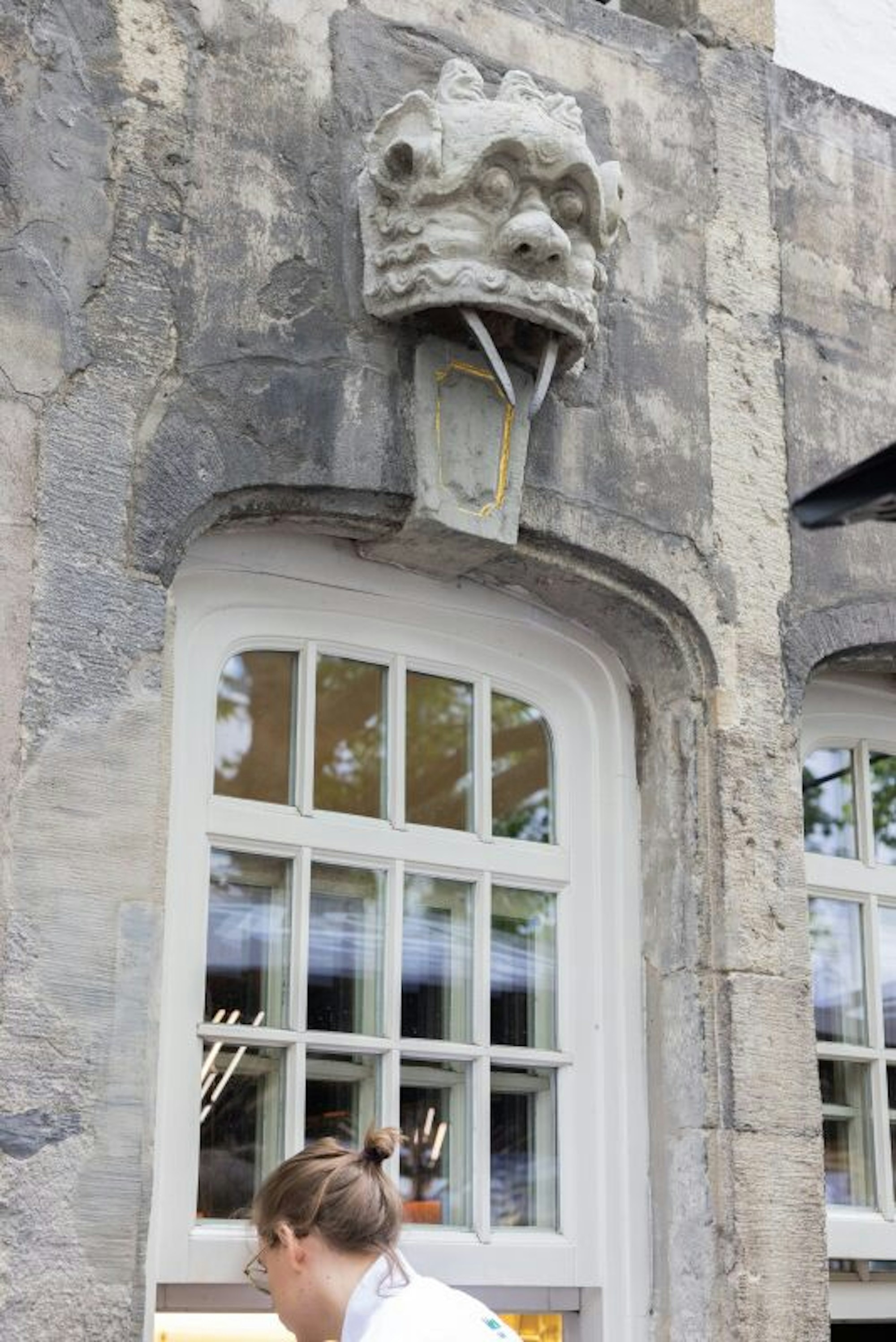 Auch an der Hauswand des Zims prangt eine der steinernen Fratzen mit gruselig-grimmigem Gesichtausdruck, die in der Altstadt an nicht wenigen Stellen zu sehen sind. Keine Augen, kein Unterkiefer, stattdessen wachsen lange walrossartige Hauer aus diesen Grimassen. Um die sogenannten Grinköpfe ranken sich einige Legenden. Die bekannteste: Erzbischof Anno ließ korrupte Schöffen blenden und an ihren Häusern solche Schandmasken anbringen. Dagmar Lutz weiß um die tatsächliche Bedeutung: „Zwischen den wie ein V spitz zulaufenden Hauern steckte man eine Stange. Mithilfe eines Seils konnte man einen simplen Flaschenzug herrichten, über den Waren gezogen werden konnten.“