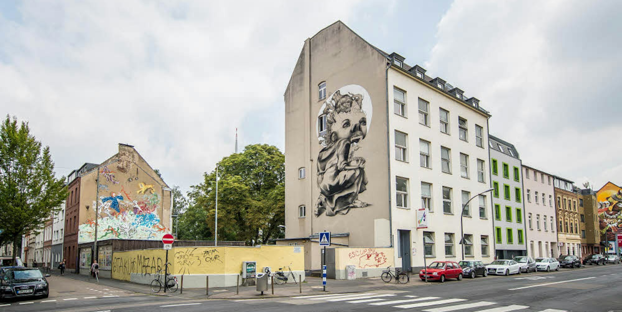 Ein großes Wandgemälde ziert die Rheinische Musikschule in Ehrenfeld. Sie soll abgerissen und neu gebaut oder saniert werden. Die Stadt will das Gelände an einen Investor verkaufen, der auch die Baulücke vorne sowie den hinteren Teil des Areals bebauen kann.