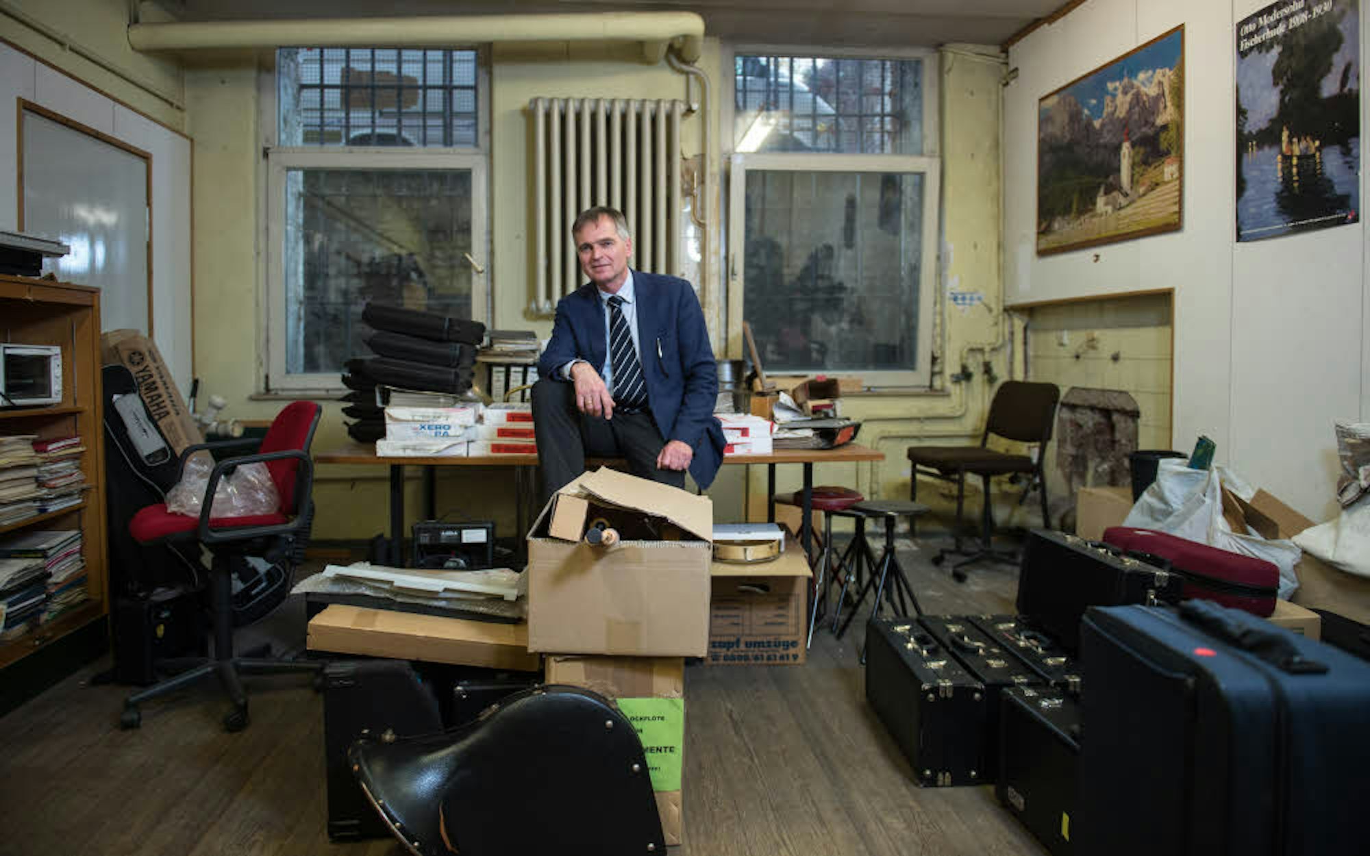 Prekäre Raumsituation: Direktor Tilman Fischer in einem Keller der Musikschule, der als Lager für Instrumente dient.