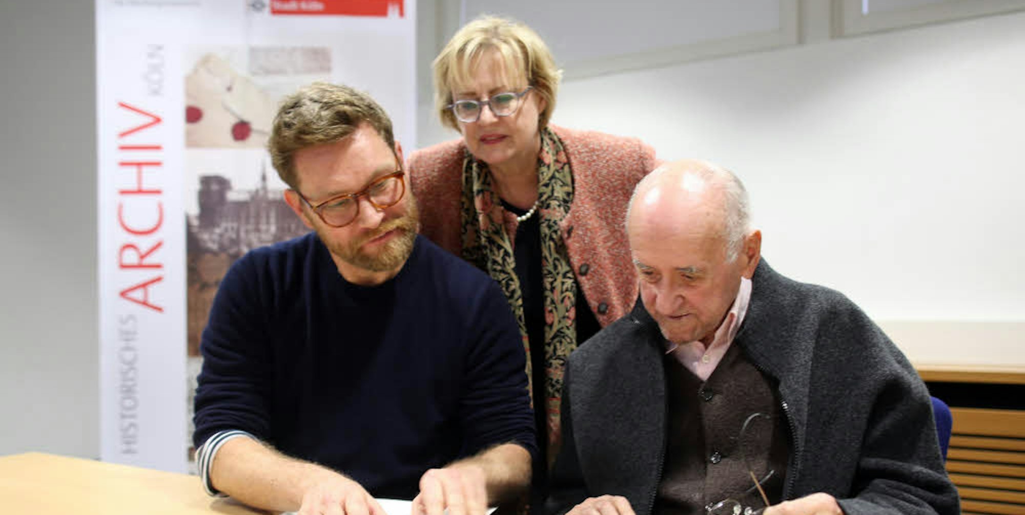 Blick in alte Notizen: Alfred Biolek (r.) , sein Adoptivsohn Scott und Archivleiterin Dr. Bettina Schmidt-Czaia.