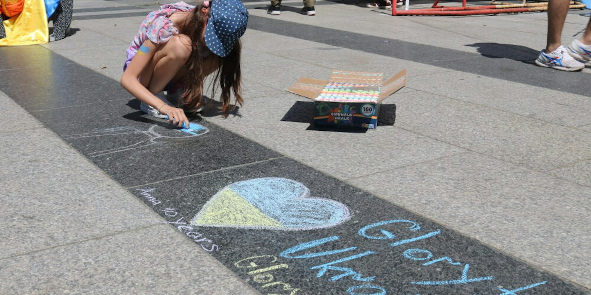 Neben ihr zeichnen noch mehr Kinder mit Kreide ukrainische Flaggen, Wappen und blau-gelbe Herzen auf den Boden. Die Zeichnungen sind Teil der Kinderdemo, die die United World Organisation (UWO) an Fronleichnam veranstaltet hat.