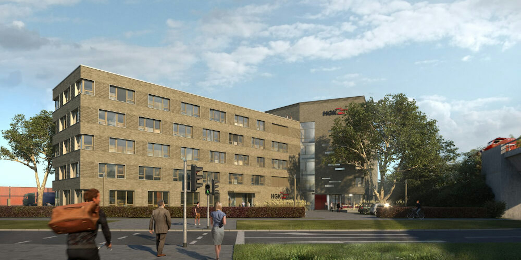 Das aus zwei Baukörpern bestehende Gebäude erinnert im Grundriss an eine Eisenbahnweiche und nimmt damit Bezug auf das Geschäftsfeld der HGK, die vor allem im Gütertransport mit Bahn und Binnenschiff aktiv ist. Der neue Firmensitz entsteht am Knotenpunkt von Boltensternstraße, Amsterdamer Straße und Industriestraße. Die HGK hat sich seit 2015 durch Zukäufe stark vergrößert und beschäftigt als europaweit aktive Logistikgruppe rund 2400 Menschen.