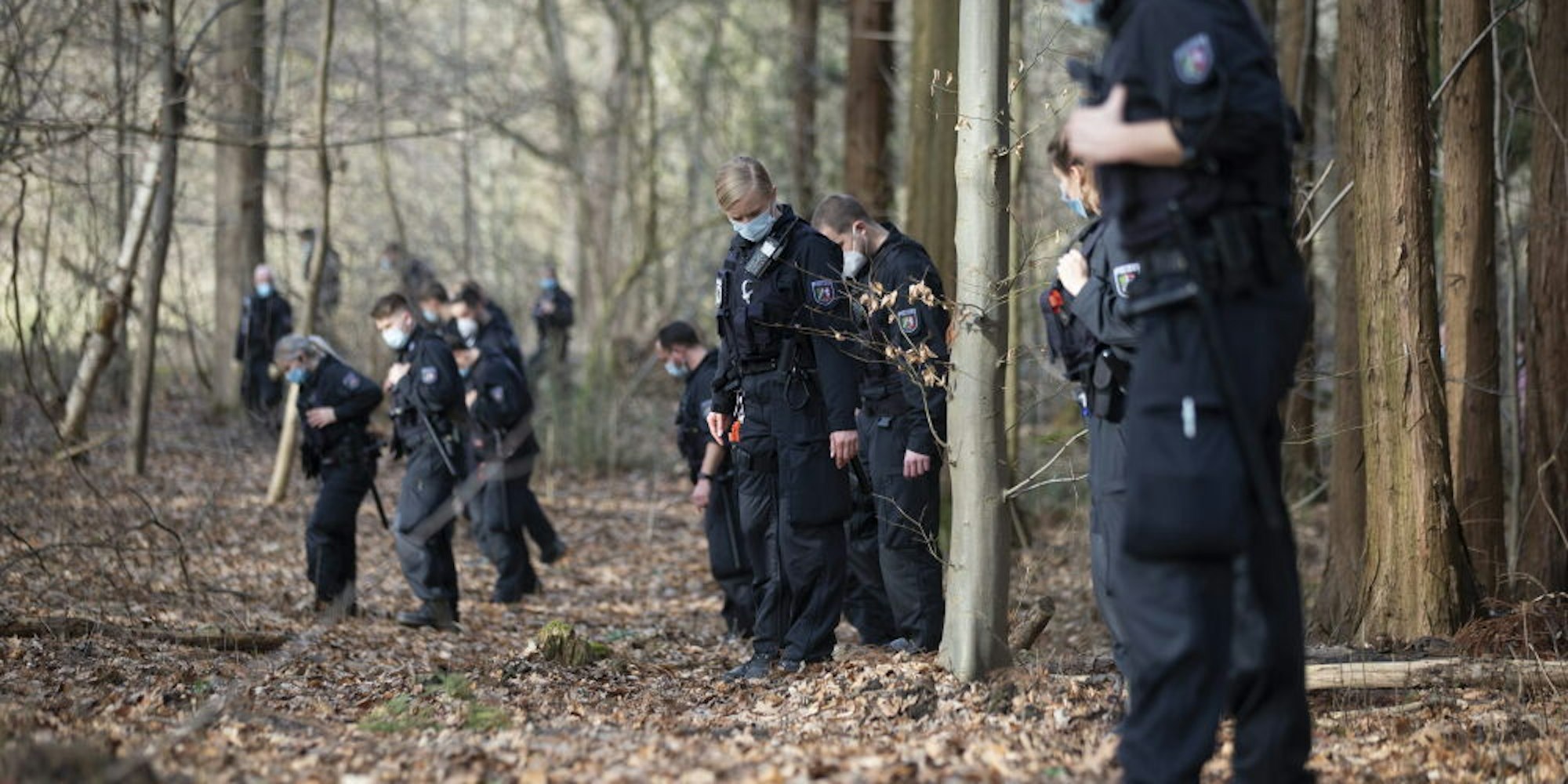 Im Stadtwald sucht eine Hundertschaft stundenlange nach Beweismaterial.