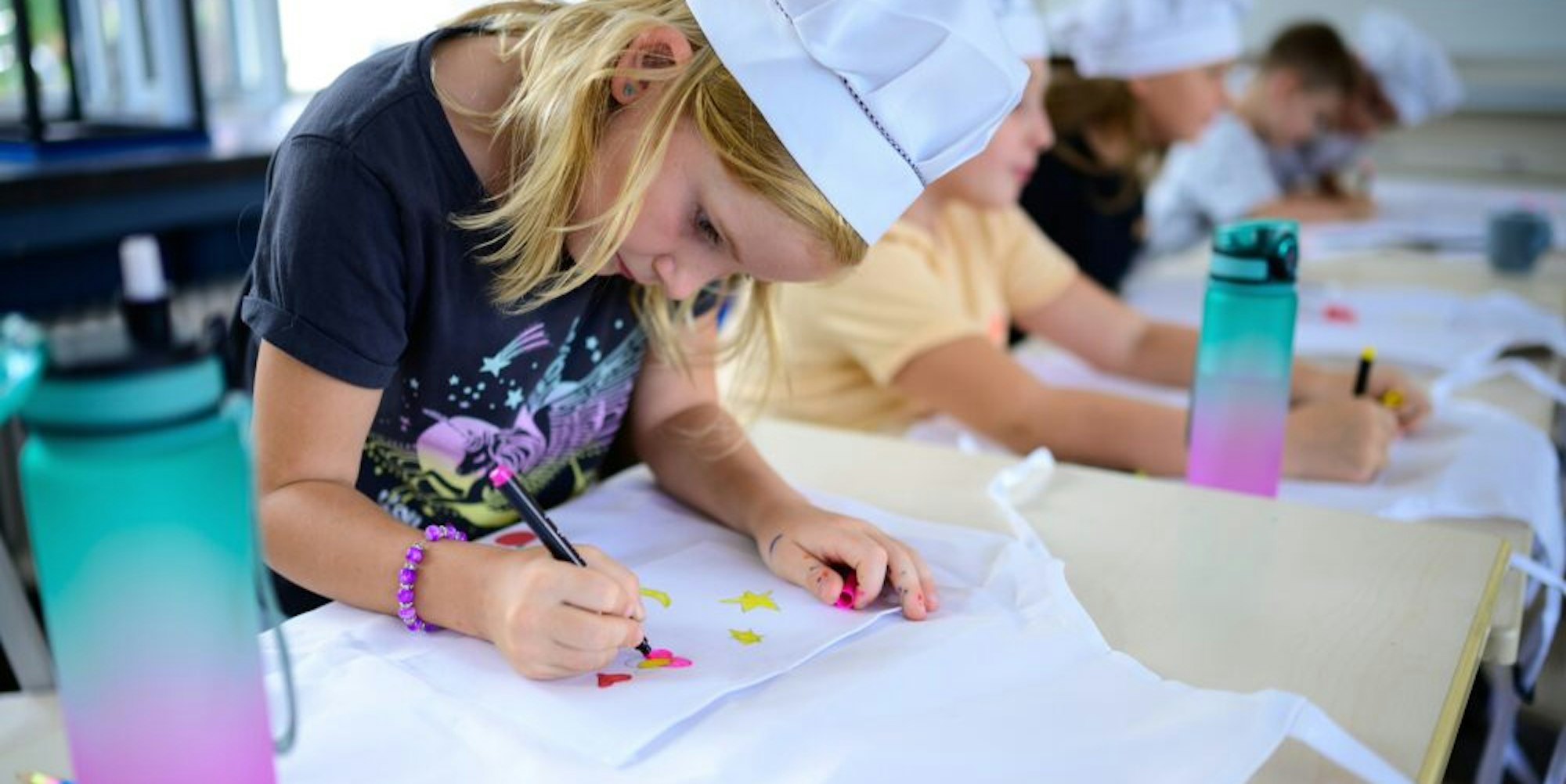 Konzentriert bei der Sache ist Emely (7), die ihre Kochschürze mit bunten Symbolen bemalt. Sie findet „Schule in den Ferien schöööön“.
