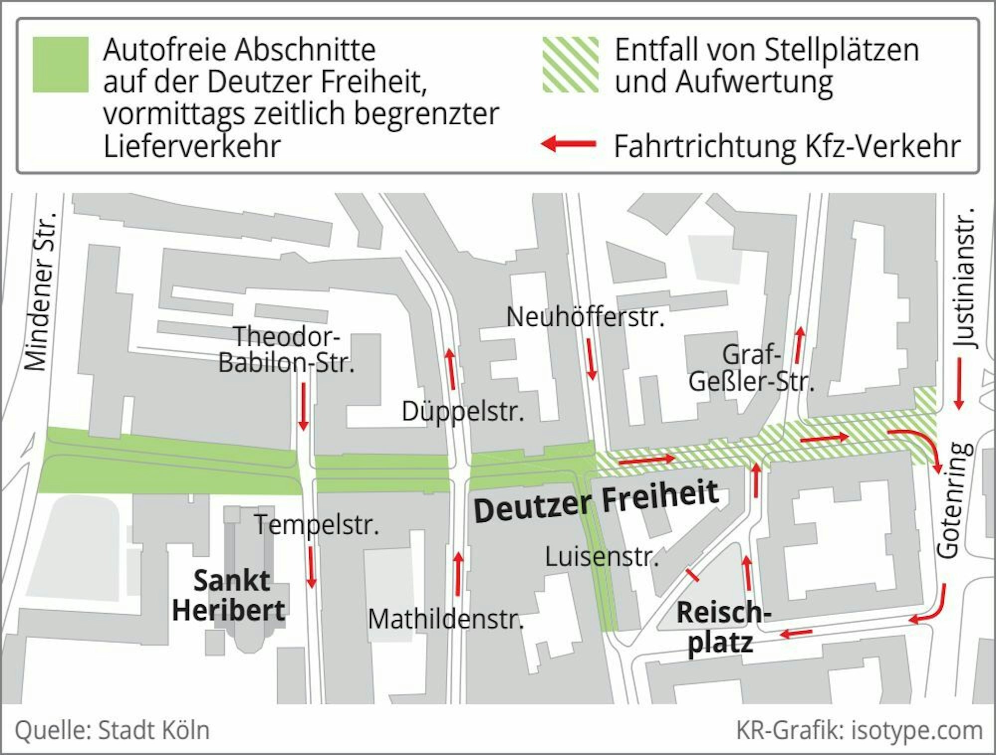 Eine Konsequenz des „Feldversuchs“ soll mehr Lebens- und Aufenthaltsqualität auf der Deutzer Freiheit sein. Die Stadtverwaltung will Initiativen für „Stadtterrassen“ anstoßen, wo sich noch Kurzzeitparkplätze befinden. Von denen werden durch die Autofreiheit 66 wegfallen. Umwege werden unvermeidlich. Die Zufahrt zu einzelnen „Quartierstraßen“ werde sich um bis zu 400 Meter verlängern, heißt es in einer Vorlage für die Gremien.