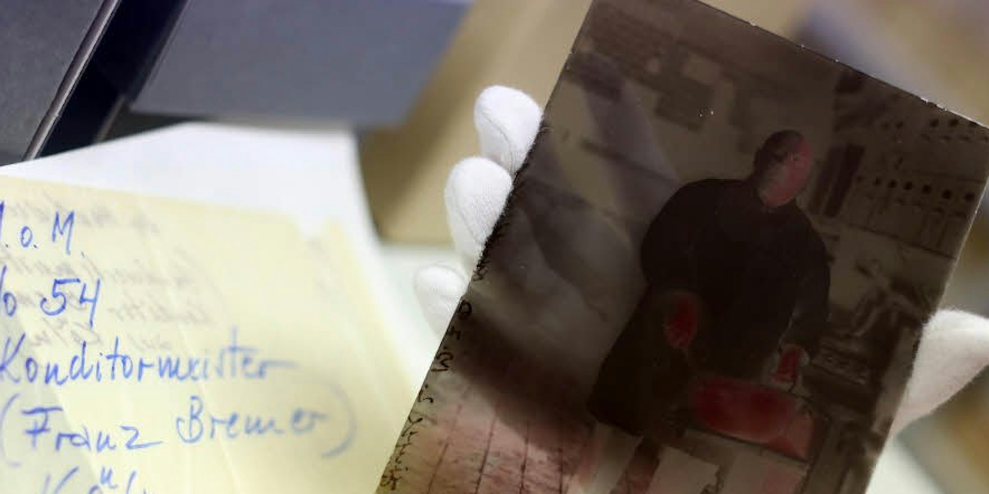Konditormeister Franz Bremer, 1928 von Sander fotografiert, auf der original Negativplatte aus Glas. (Foto: Hanano)