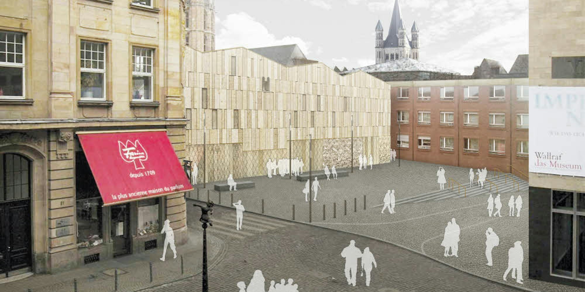 Der Augustusplatz von Haus Neuerburg aus gesehen, links das Farina-Haus, rechts das Wallraf-Richartz-Museum (WRM). Die Straße zwischen „Miqua“ und WRM ist „Obenmarspforten“.